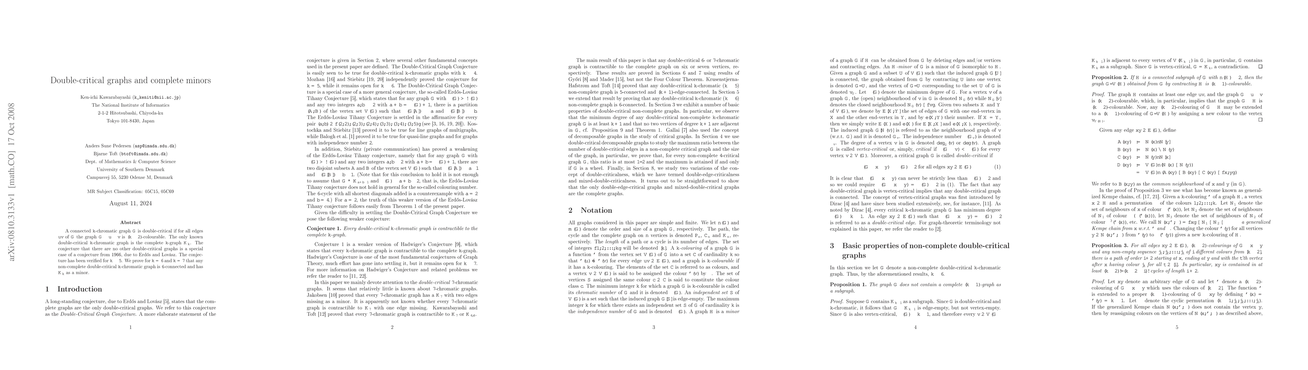 A connected $k$-chromatic graph $G$ is double-critical if for all edges $uv$ of $G$ the graph $G - u - v$ is $(k-2)$-colourable. The only known double-critical $k$-chromatic graph is the complete $k$-graph $K_k$. The conjecture that there are no other double-critical graphs is a special case of a conjecture from 1966, due to Erd\H{o}s and Lov\'asz. The conjecture has been verified for $k \leq 5$. We prove for $k=6$ and $k=7$ that any non-complete double-critical $k$-chromatic graph is 6-connected and has $K_k$ as a minor.