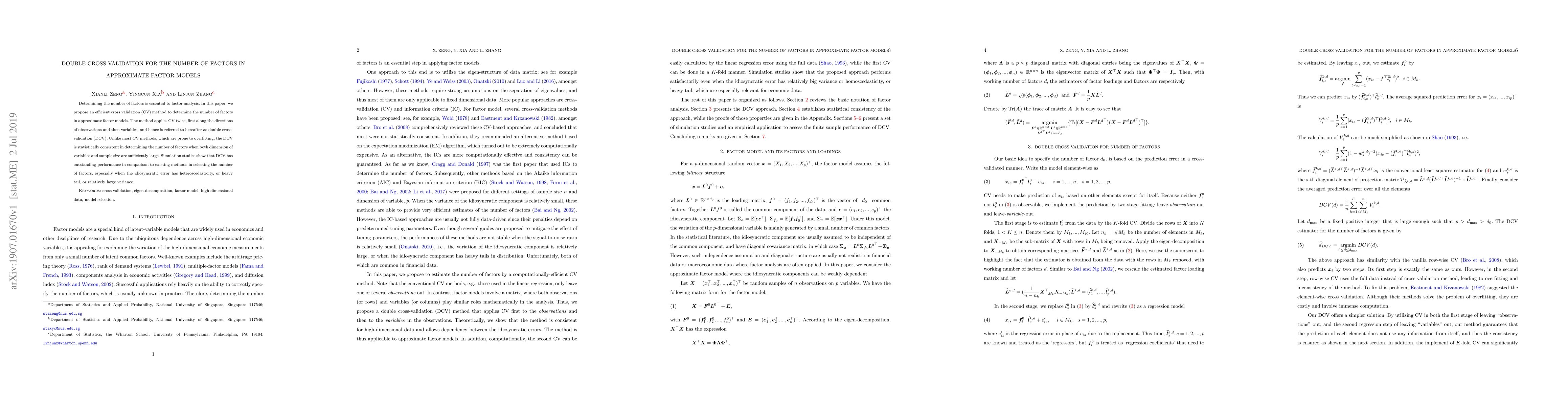 This paper proposes a double cross validation (DCV) method to determine the optimal number of factors in approximate factor models, applying CV twice along observations and variables. Unlike traditional CV methods, DCV is statistically consistent and performs better, especially under heteroscedasticity, heavy tails, or large idiosyncratic error variances, as shown by simulation studies.