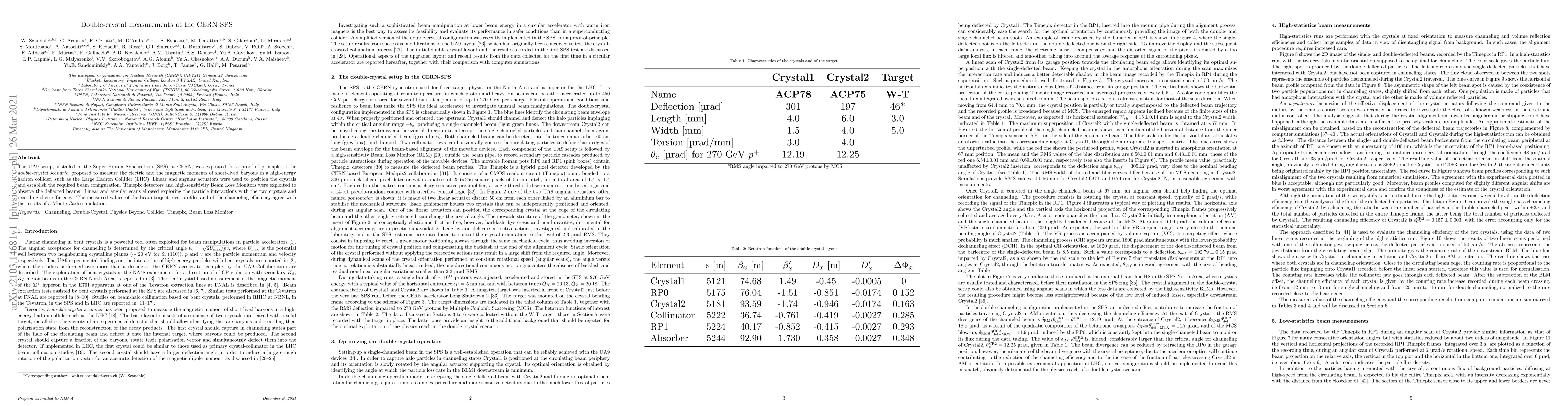 The UA9 setup at CERN's SPS demonstrated the feasibility of the double-crystal method for measuring the electric and magnetic moments of short-lived baryons, using Timepix detectors and high-sensitivity Beam Loss Monitors. The results of the linear and angular scans matched Monte-Carlo simulations, confirming the method's potential for future high-energy collider experiments.