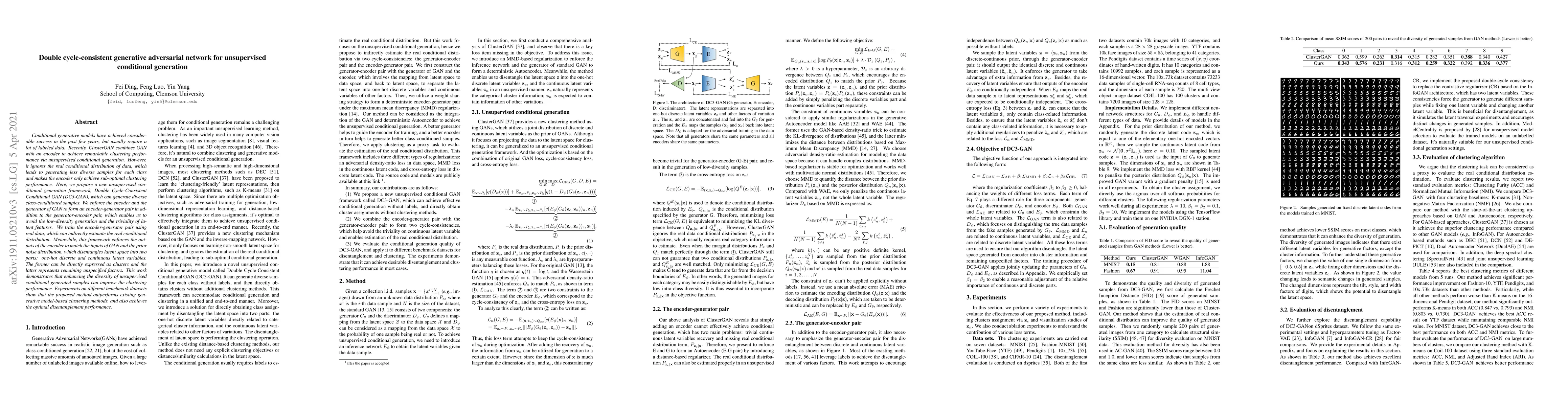 Conditional generative models have achieved considerable success in the past few years, but usually require a lot of labeled data. Recently, ClusterGAN combines GAN with an encoder to achieve remarkable clustering performance via unsupervised conditional generation. However, it ignores the real conditional distribution of data, which leads to generating less diverse samples for each class and makes the encoder only achieve sub-optimal clustering performance. Here, we propose a new unsupervised conditional generation framework, Double Cycle-Consistent Conditional GAN (DC3-GAN), which can generate diverse class-conditioned samples. We enforce the encoder and the generator of GAN to form an encoder-generator pair in addition to the generator-encoder pair, which enables us to avoid the low-diversity generation and the triviality of latent features. We train the encoder-generator pair using real data, which can indirectly estimate the real conditional distribution. Meanwhile, this framework enforces the outputs of the encoder to match the inputs of GAN and the prior noise distribution, which disentangles latent space into two parts: one-hot discrete and continuous latent variables. The former can be directly expressed as clusters and the latter represents remaining unspecified factors. This work demonstrates that enhancing the diversity of unsupervised conditional generated samples can improve the clustering performance. Experiments on different benchmark datasets show that the proposed method outperforms existing generative model-based clustering methods, and also achieves the optimal disentanglement performance.