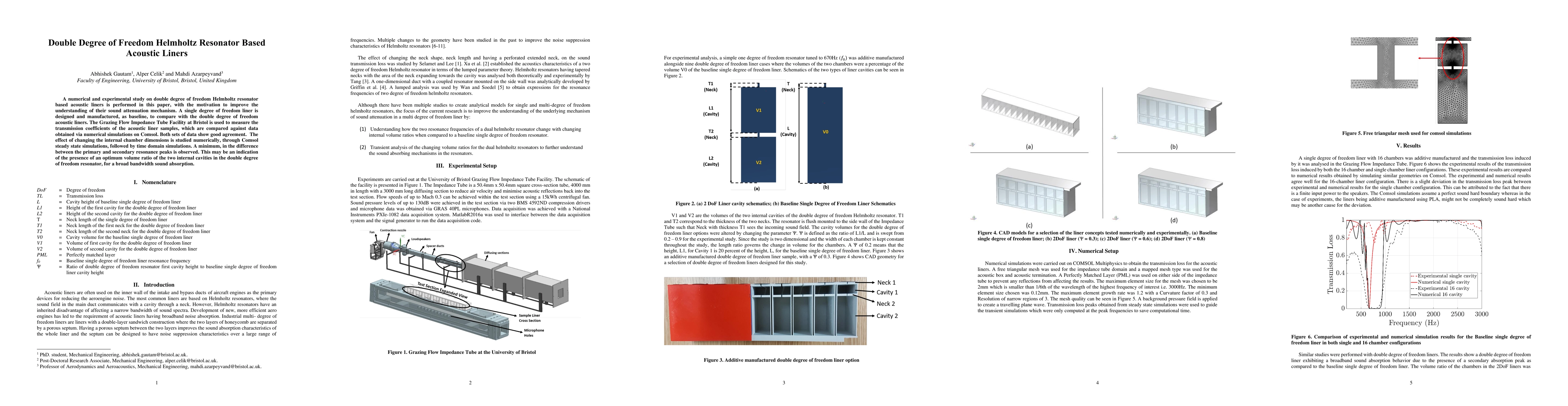 A numerical and experimental study on double degree of freedom Helmholtz resonator based acoustic liners is performed in this paper, with the motivation to improve the understanding of their sound attenuation mechanism. A single degree of freedom liner is designed and manufactured, as baseline, to compare with the double degree of freedom acoustic liners. The Grazing Flow Impedance Tube Facility at Bristol is used to measure the transmission coefficients of the acoustic liner samples, which are compared against data obtained via numerical simulations on Comsol. Both sets of data show good agreement. The effect of changing the internal chamber dimensions is studied numerically, through Comsol steady state simulations, followed by time domain simulations. A minimum, in the difference between the primary and secondary resonance peaks is observed. This may be an indication of the presence of an optimum volume ratio of the two internal cavities in the double degree of freedom resonator, for a broad bandwidth sound absorption.