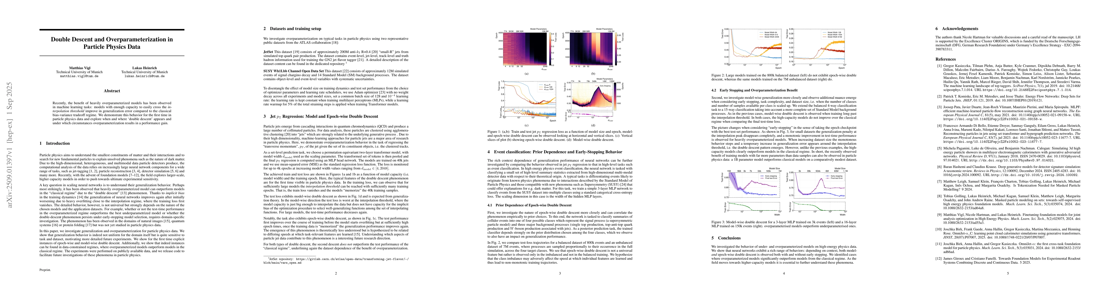 Recently, the benefit of heavily overparameterized models has been observed in machine learning tasks: models with enough capacity to easily cross the \emph{interpolation threshold} improve in generalization error compared to the classical bias-variance tradeoff regime. We demonstrate this behavior for the first time in particle physics data and explore when and where `double descent' appears and under which circumstances overparameterization results in a performance gain.