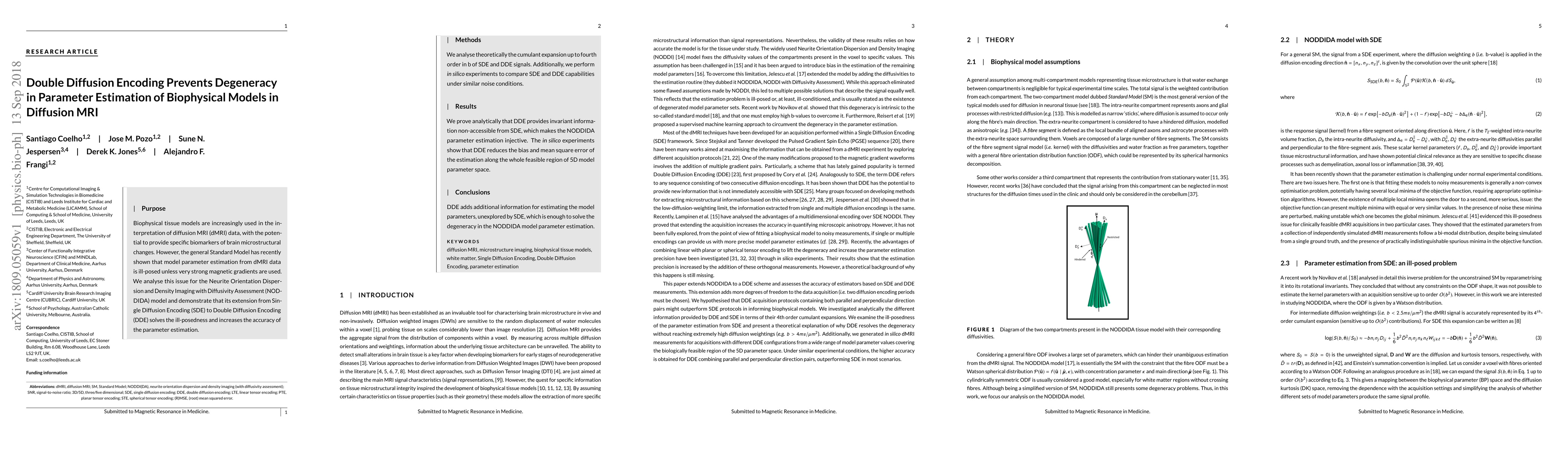 Purpose: Biophysical tissue models are increasingly used in the interpretation of diffusion MRI (dMRI) data, with the potential to provide specific biomarkers of brain microstructural changes. However, the general Standard Model has recently shown that model parameter estimation from dMRI data is ill-posed unless very strong magnetic gradients are used. We analyse this issue for the Neurite Orientation Dispersion and Density Imaging with Diffusivity Assessment (NODDIDA) model and demonstrate that its extension from Single Diffusion Encoding (SDE) to Double Diffusion Encoding (DDE) solves the ill-posedness and increases the accuracy of the parameter estimation. Methods: We analyse theoretically the cumulant expansion up to fourth order in b of SDE and DDE signals. Additionally, we perform in silico experiments to compare SDE and DDE capabilities under similar noise conditions. Results: We prove analytically that DDE provides invariant information non-accessible from SDE, which makes the NODDIDA parameter estimation injective. The in silico experiments show that DDE reduces the bias and mean square error of the estimation along the whole feasible region of 5D model parameter space. Conclusions: DDE adds additional information for estimating the model parameters, unexplored by SDE, which is enough to solve the degeneracy in the NODDIDA model parameter estimation.