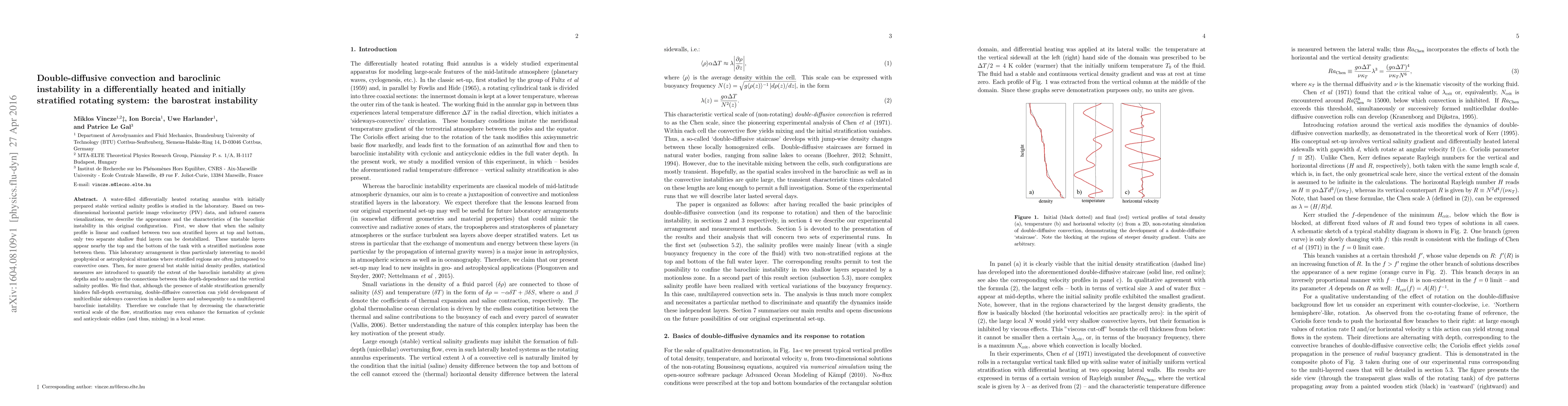 This study investigates double-diffusive convection and baroclinic instability in a rotating, differentially heated water annulus with stable vertical salinity profiles. The research reveals that linear salinity profiles can destabilize shallow fluid layers near the tank's top and bottom, while stable stratification can enhance local cyclonic and anticyclonic eddy formation through multicellular sideways convection.