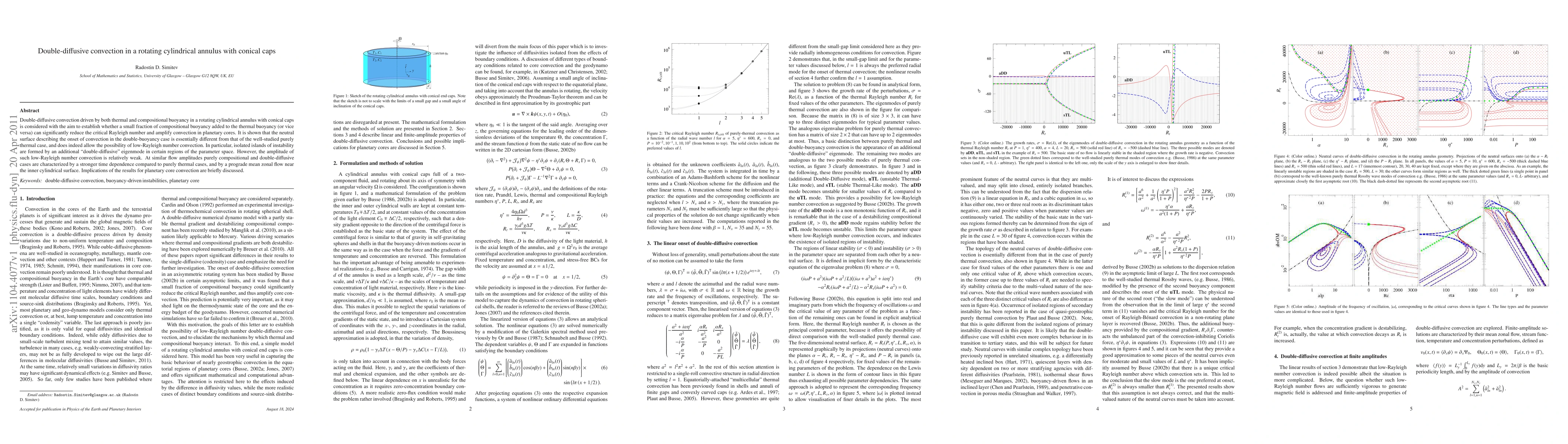 This study investigates double-diffusive convection in a rotating cylindrical annulus with conical caps, revealing that a small compositional buoyancy fraction can significantly reduce the critical Rayleigh number and amplify convection. The research identifies a distinct "double-diffusive" eigenmode that allows for low-Rayleigh number convection, although its amplitude is relatively weak.