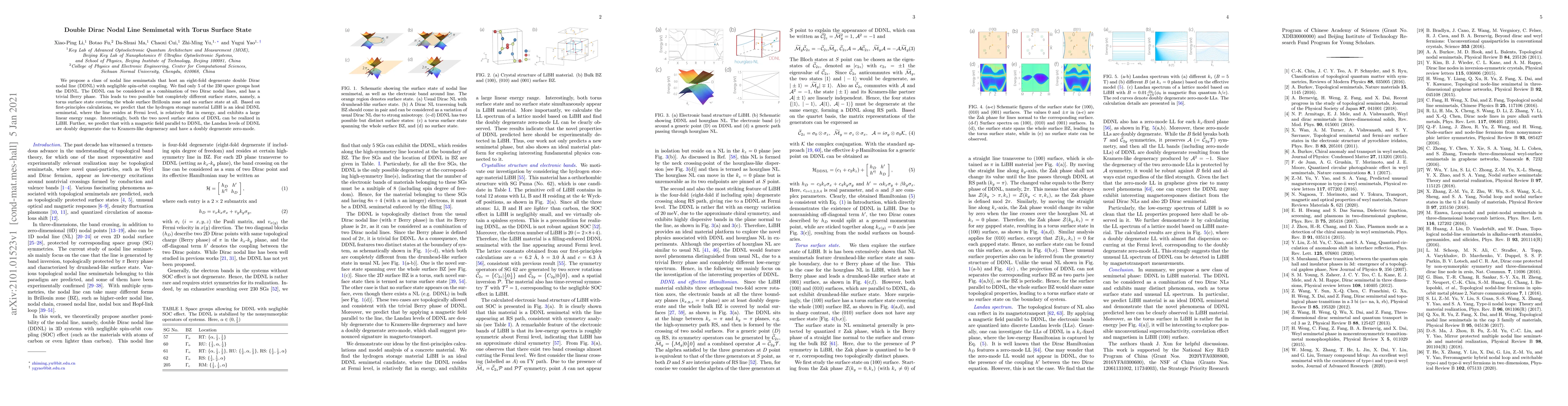 This paper introduces a new type of nodal line semimetal featuring an eight-fold degenerate double Dirac nodal line with negligible spin-orbit coupling, predicted to occur in LiBH. It discusses the unique torus surface state and the absence of surface states, and highlights the material's potential for hydrogen storage and magnetic field-induced Landau levels.