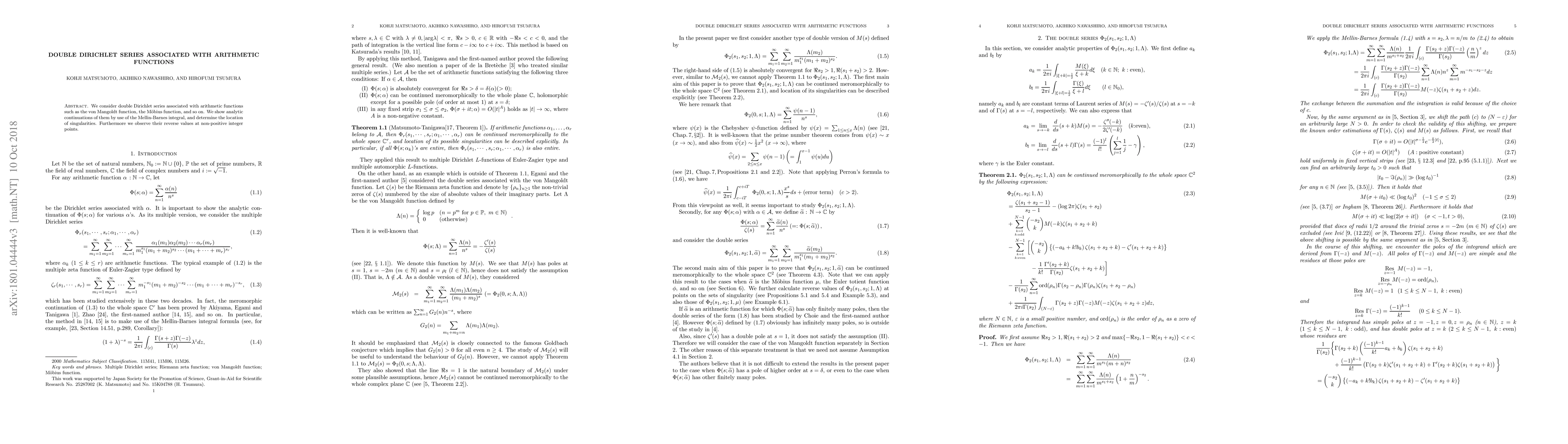 This paper explores double Dirichlet series linked to arithmetic functions like the von Mangoldt and Möbius functions, demonstrating their analytic continuations via the Mellin-Barnes integral and examining their reverse values at non-positive integer points.