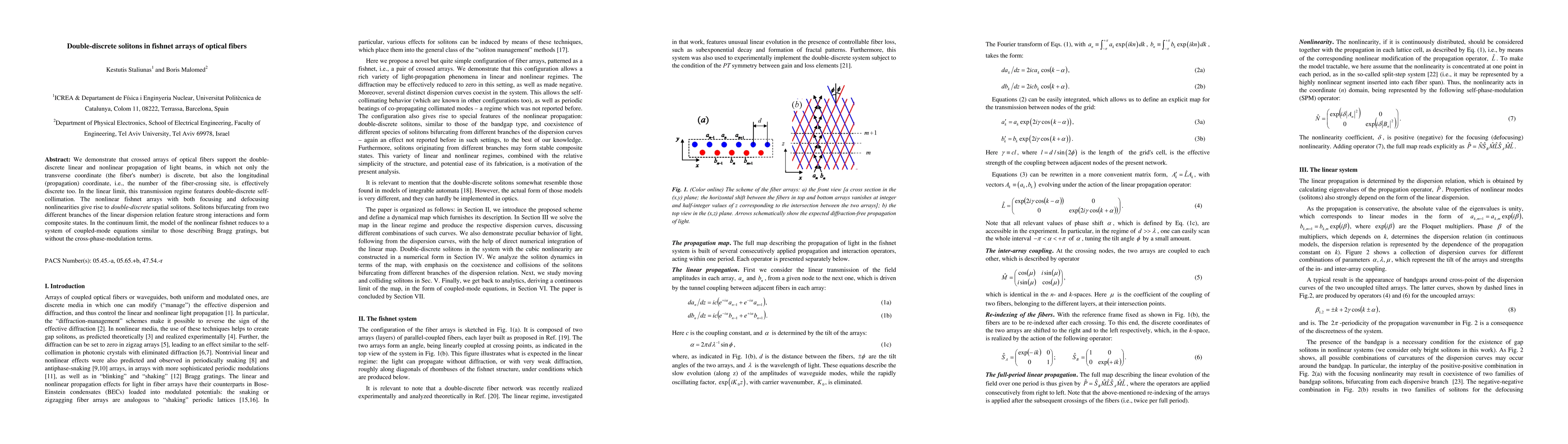 We demonstrate that crossed arrays of optical fibers support the double-discrete linear and nonlinear propagation of light beams, in which not only the transverse coordinate (the fiber's number) is discrete, but also the longitudinal (propagation) coordinate, i.e., the number of the fiber-crossing site, is effectively discrete too. In the linear limit, this transmission regime features double-discrete self-collimation. The nonlinear fishnet arrays with both focusing and defocusing nonlinearities give rise to double-discrete spatial solitons. Solitons bifurcating from two different branches of the linear dispersion relation feature strong interactions and form composite states. In the continuum limit, the model of the nonlinear fishnet reduces to a system of coupled-mode equations similar to those describing Bragg gratings, but without the cross-phase-modulation terms.