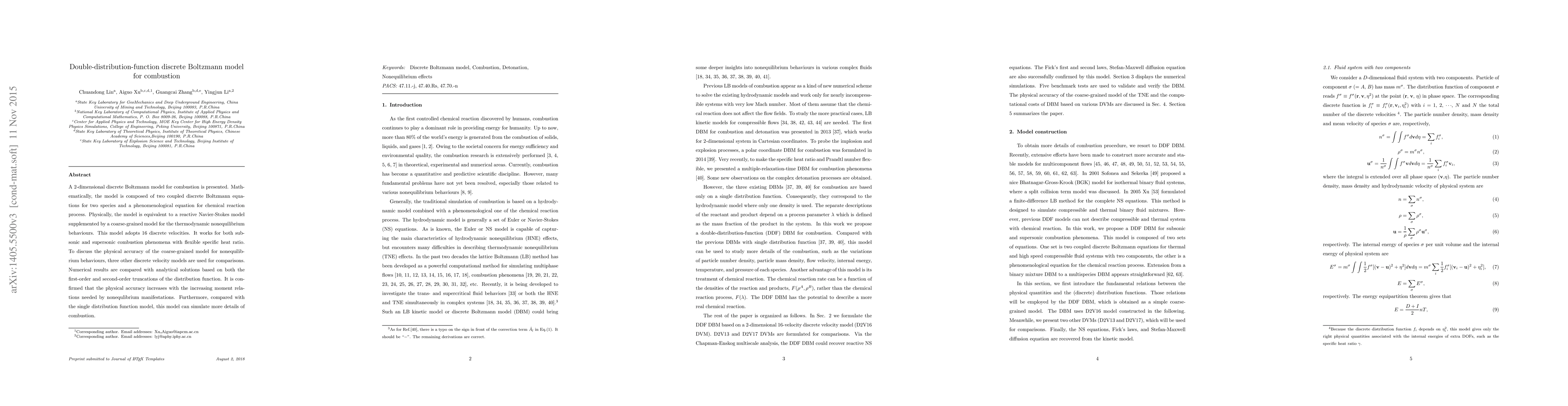 This paper presents a double-distribution-function discrete Boltzmann model for combustion, composed of two coupled equations for two species and a chemical reaction equation. The model accurately simulates both subsonic and supersonic combustion with flexible specific heat ratios and demonstrates improved physical accuracy compared to single distribution function models.