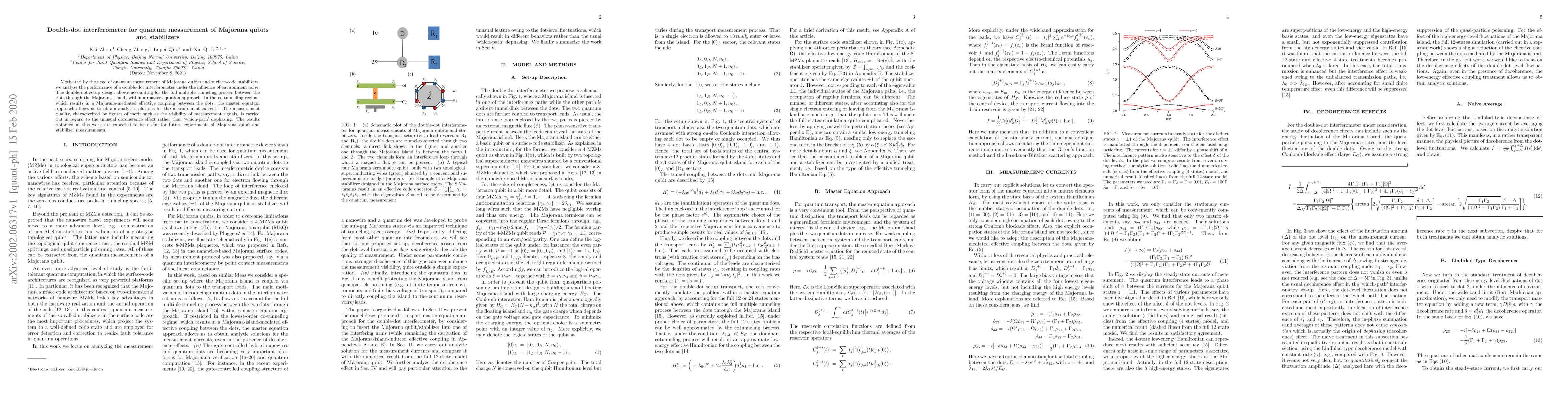 This paper investigates the performance of a double-dot interferometer for quantum measurement of Majorana qubits and stabilizers, analyzing the influence of environmental noise. The study employs a master equation approach to account for the full tunneling process, yielding analytic solutions for measurement currents in the co-tunneling regime.