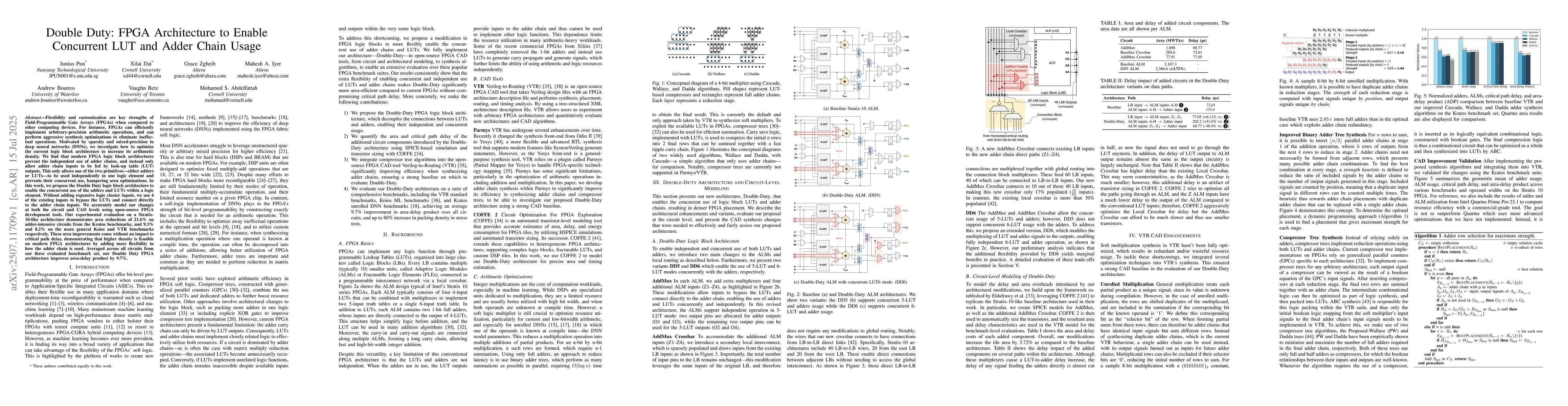 The Double-Duty architecture and enhanced VTR CAD toolchain with optimized synthesis algorithms for adder chains.