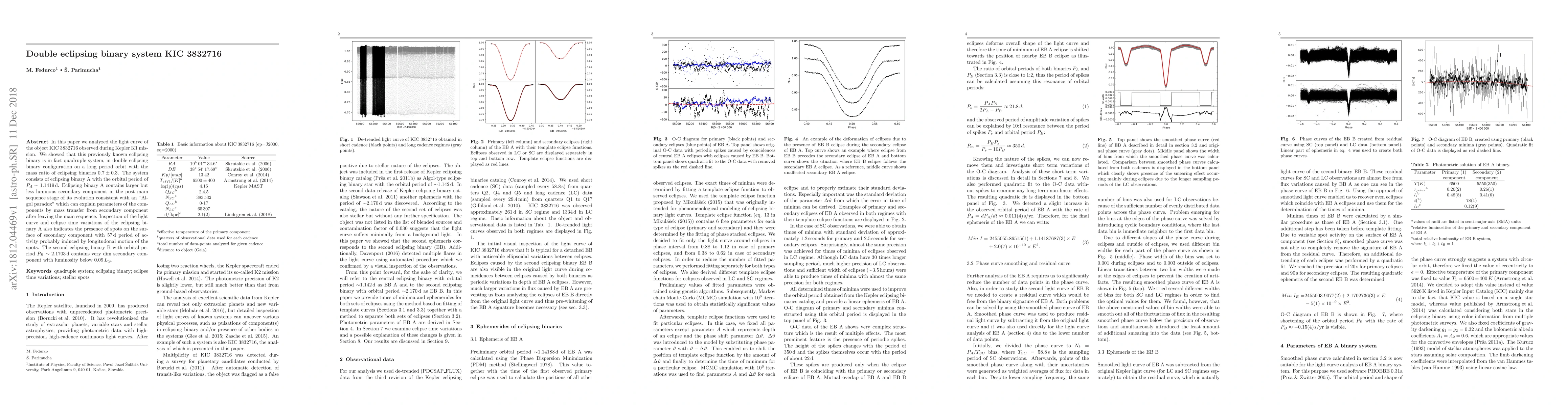 In this paper we analyzed the light curve of the object KIC~3832716 observed during Kepler K1 mission. We showed that this previously known eclipsing binary is in fact quadruple system, in double eclipsing binary configuration on a long period orbit with the mass ratio of eclipsing binaries $0.7 \pm 0.3$. The system consists of eclipsing binary A with the orbital period of $P_A \sim 1.1419$\,d. Eclipsing binary A contains larger but less luminous secondary component in the post main sequence stage of its evolution consistent with an "Algol paradox" which can explain parameters of the components by mass transfer from secondary component after leaving the main sequence. Inspection of the light curve and eclipse time variations of the eclipsing binary A also indicates the presence of spots on the surface of secondary component with $57$\,d period of activity probably induced by longitudonal motion of the spots. The second eclipsing binary B with orbital period $P_B \sim 2.1703$\,d contains very dim secondary component with luminosity below 0.09\,$L_{\odot}$.