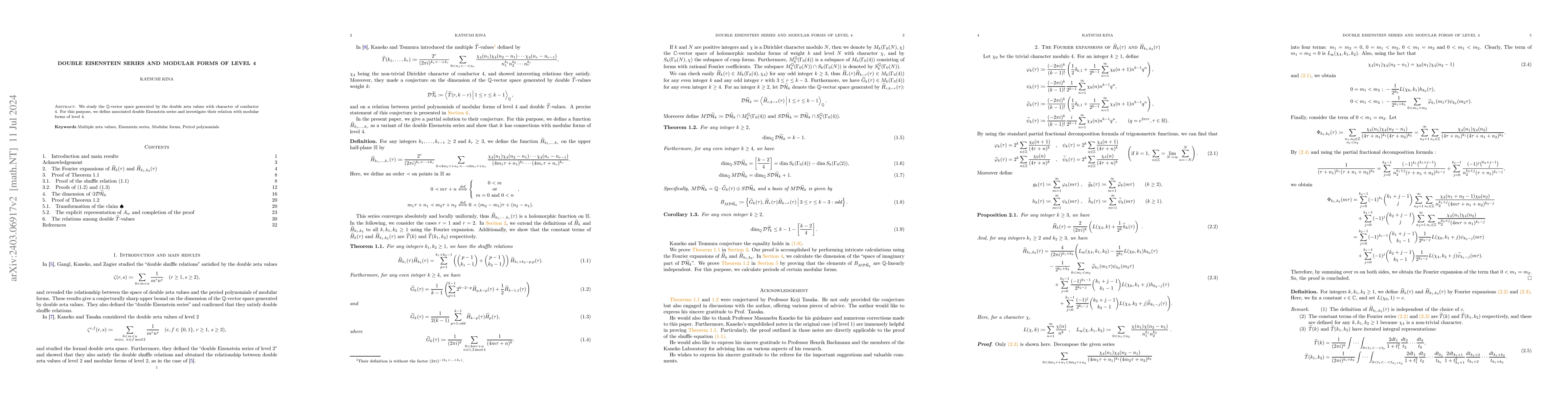 This paper examines the $\mthbb{Q}$-vector space of double zeta values with a character of conductor $4$, defining associated double Eisenstein series and exploring their connections to modular forms of level $4$.