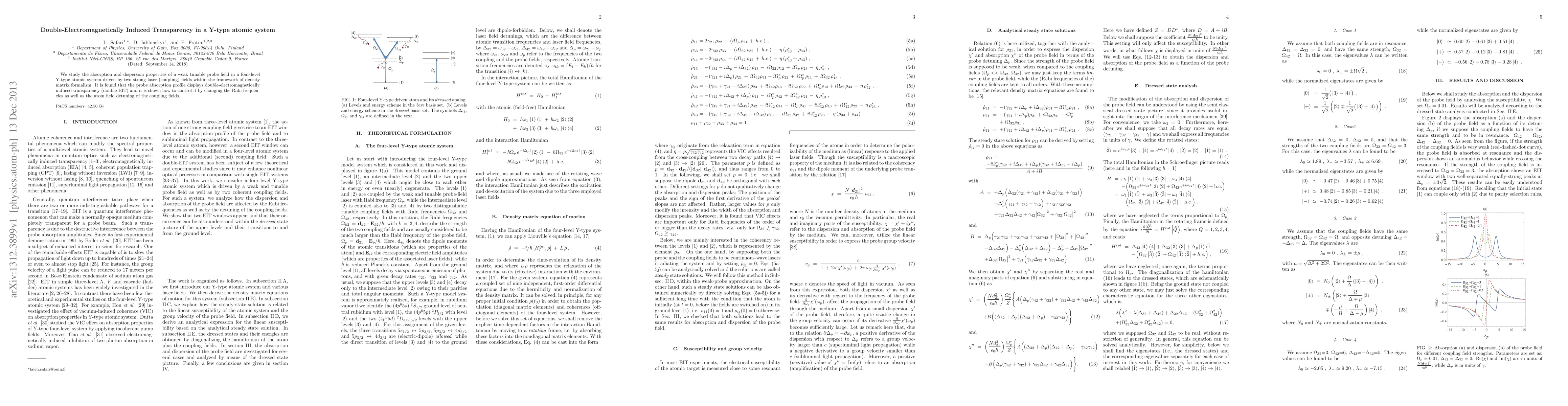 This study explores double-electromagnetically induced transparency (double-EIT) in a four-level Y-type atomic system driven by two strong laser fields, revealing controllable absorption profiles via density matrix formalism. The double-EIT phenomenon is manipulated by adjusting the Rabi frequencies and detuning of the coupling fields.