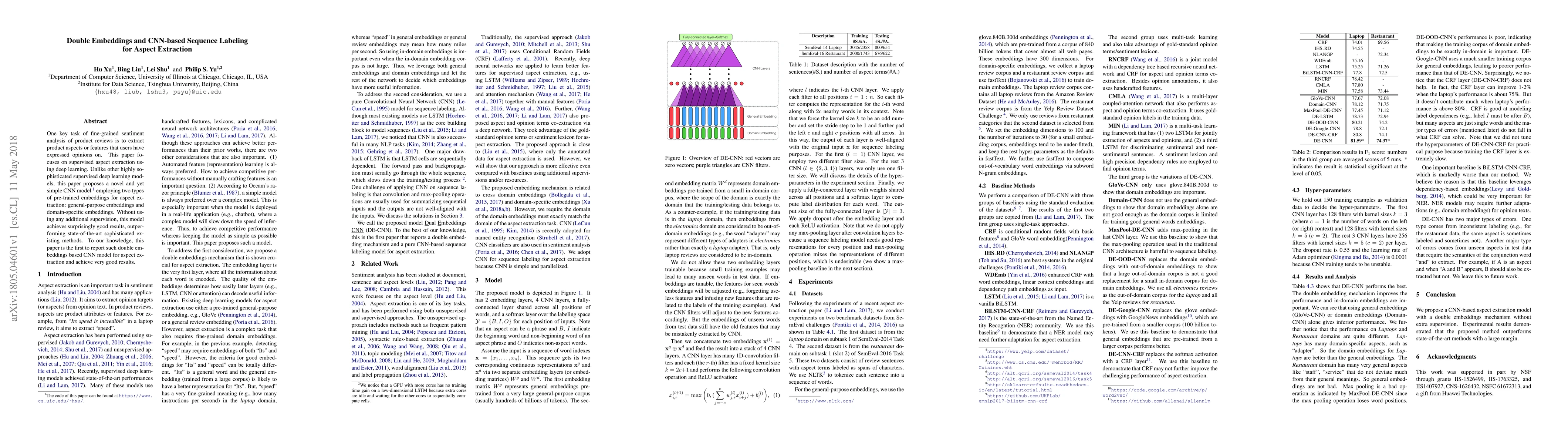 This paper proposes a simple CNN model using double embeddings—general-purpose and domain-specific—for aspect extraction in sentiment analysis, achieving superior results without additional supervision compared to state-of-the-art methods. To date, this is the first report of such a double embeddings based CNN model for this task.