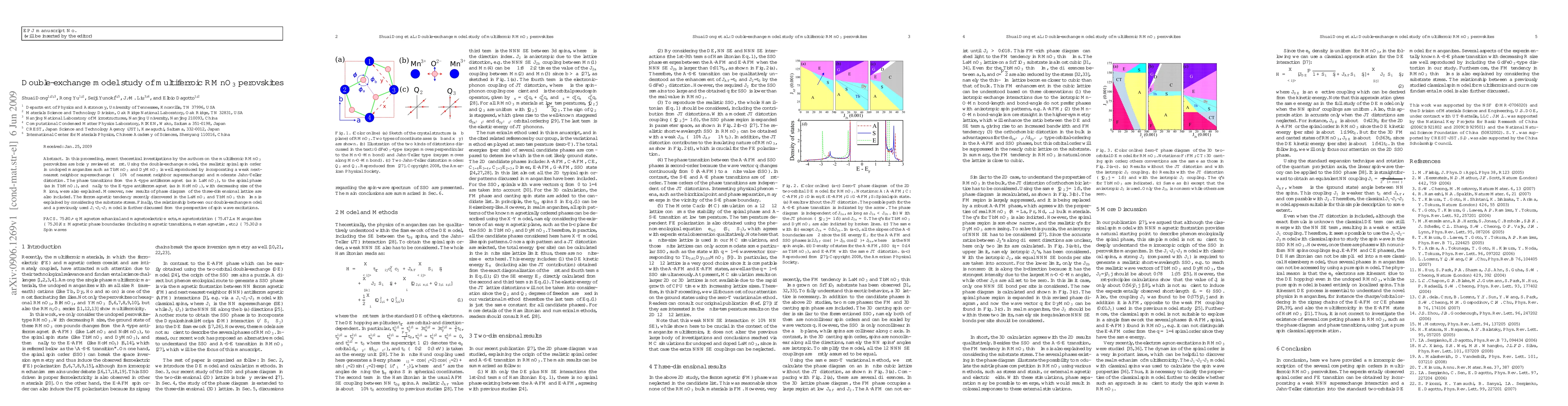 This paper reviews theoretical studies of multiferroic $R$MnO$_3$ perovskites using the double-exchange model, explaining the spiral spin order and phase transitions in undoped manganites, and discusses the influence of substrate stress on thin films. It also compares the double-exchange model with a $J_1$-$J_2$-$J_3$ model regarding spin wave excitations.