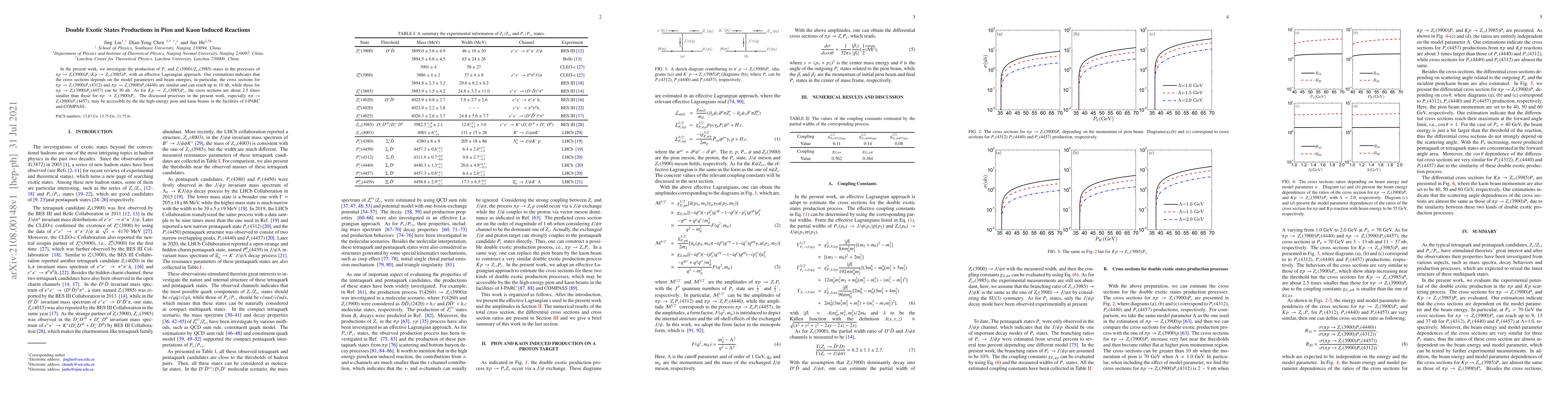 In the present work, we investigate the production of $P_{c}$ and $Z_c(3900)/Z_{cs}(3985)$ states in the processes of $\pi p \rightarrow Z_{c}(3900) P_{c} $/$Kp\rightarrow Z_{cs}(3985) P_{c}$ with an effective Lagrangian approach. Our estimations indicates that the cross sections depends on the model parameters and beam energies, in particular, the cross sections for $\pi p \to Z_c(3900) P_c(4312)$ and $\pi p \to Z_c(3900) P_c(4440)$ are similar and can reach up to 10 nb, while those for $\pi p \to Z_c(3900) P_c(4457)$ can be 30 nb. As for $Kp \to Z_{cs}(3985)P_c$, the cross sections are about 2.5 times smaller than those for $\pi p \to Z_c(3900) P_c$. The discussed processes in the present work, especially $\pi p \to Z_c(3900) P_c(4457)$, may be accessible by the the high-energy pion and kaon beams in the facilities of J-PARC and COMPASS.