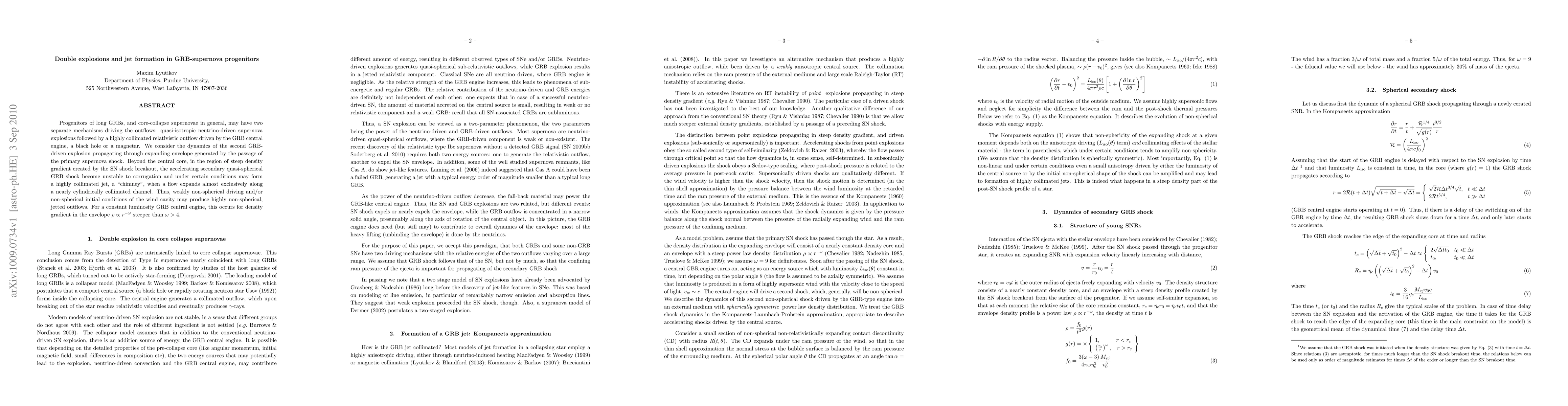 Progenitors of long GRBs, and core-collapse supernovae in general, may have two separate mechanisms driving the outflows: quasi-isotropic neutrino-driven supernova explosions followed by a highly collimated relativistic outflow driven by the GRB central engine, a black hole or a magnetar. We consider the dynamics of the second GRB-driven explosion propagating through expanding envelope generated by the passage of the primary supernova shock. Beyond the central core, in the region of steep density gradient created by the SN shock breakout, the accelerating secondary quasi-spherical GRB shock become unstable to corrugation and under certain conditions may form a highly collimated jet, a "chimney", when a flow expands almost exclusively along a nearly cylindrically collimated channel. Thus, weakly non-spherical driving and/or non-spherical initial conditions of the wind cavity may produce highly non-spherical, jetted outflows. For a constant luminosity GRB central engine, this occurs for density gradient in the envelope \rho ~ r^{-\omega} steeper than \omega >4.