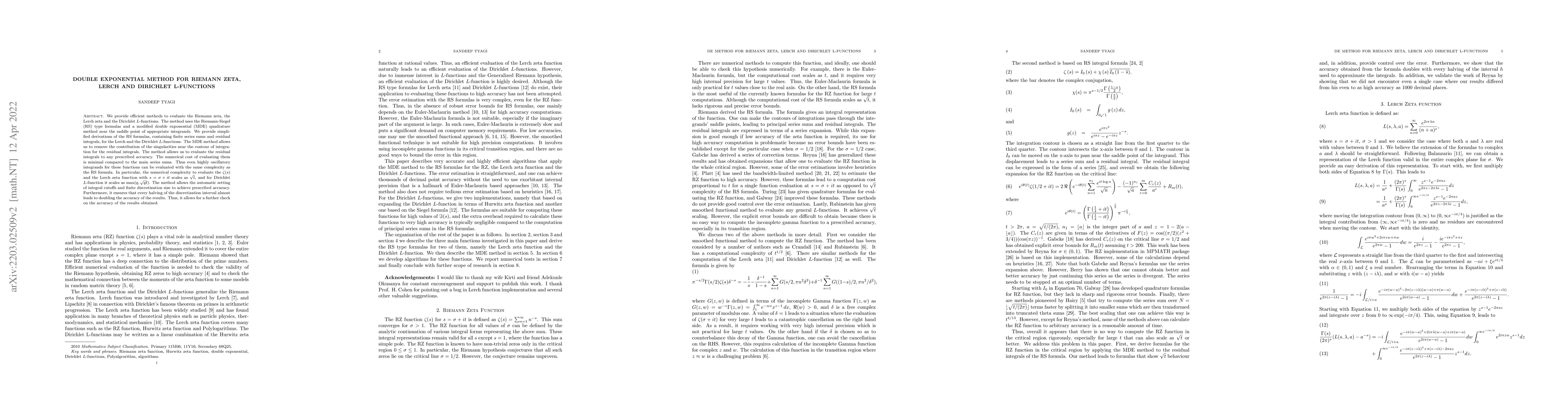 This paper presents an efficient evaluation method for the Riemann zeta, Lerch zeta, and Dirichlet L-functions using modified double exponential quadrature, which significantly reduces computational complexity. The method leverages Riemann-Siegel formulas and allows for precise evaluation of highly oscillatory integrals with minimal numerical cost.