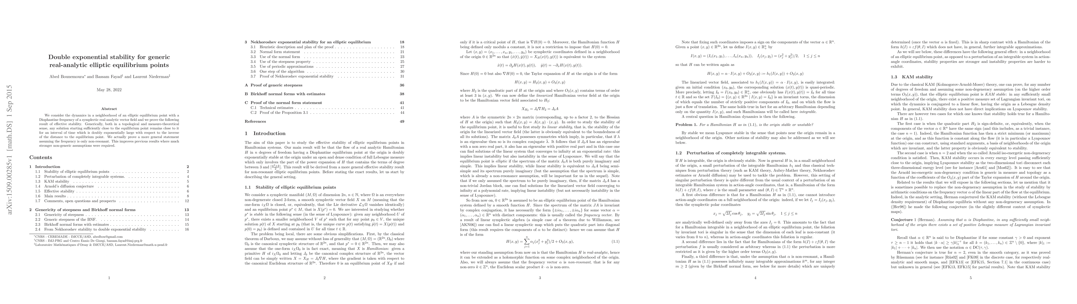 This paper proves double exponential stability for generic real-analytic elliptic equilibrium points in symplectic vector fields, showing that solutions remain close to the equilibrium for a doubly exponentially large time interval relative to their initial distance. This result generalizes previous findings by removing the need for non-generic assumptions.