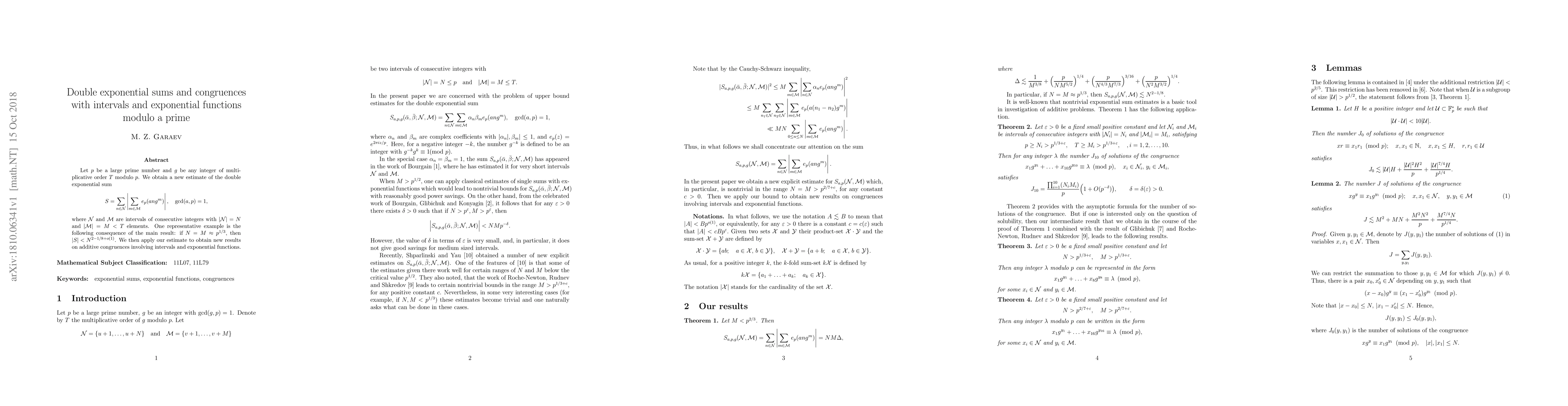 Researchers estimate a new bound for double exponential sums involving intervals and exponential functions modulo a prime number, improving previous results with a specific interval length approximation.