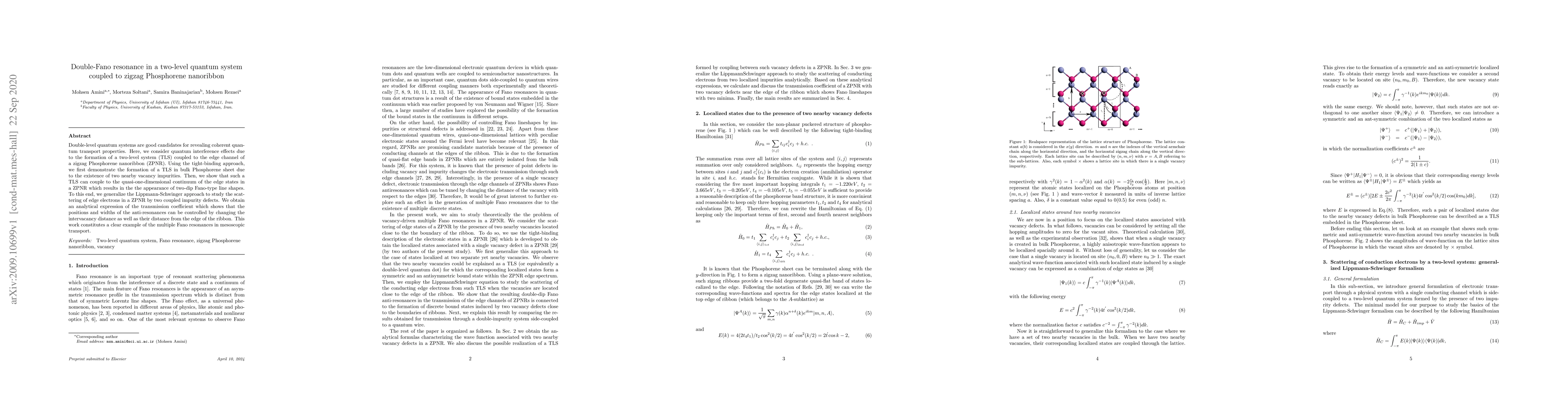 Double-level quantum systems are good candidates for revealing coherent quantum transport properties. Here, we consider quantum interference effects due to the formation of a two-level system (TLS) coupled to the edge channel of a zigzag Phosphorene nanoribbon (ZPNR). Using the tight-binding approach, we first demonstrate the formation of a TLS in bulk Phosphorene sheet due to the existence of two nearby vacancy impurities. Then, we show that such a TLS can couple to the quasi-one-dimensional continuum of the edge states in a ZPNR which results in the the appearance of two-dip Fano-type line shapes. To this end, we generalize the Lippmann-Schwinger approach to study the scattering of edge electrons in a ZPNR by two coupled impurity defects. We obtain an analytical expression of the transmission coefficient which shows that the positions and widths of the anti-resonances can be controlled by changing the intervacancy distance as well as their distance from the edge of the ribbon. This work constitutes a clear example of the multiple Fano resonances in mesoscopic transport.