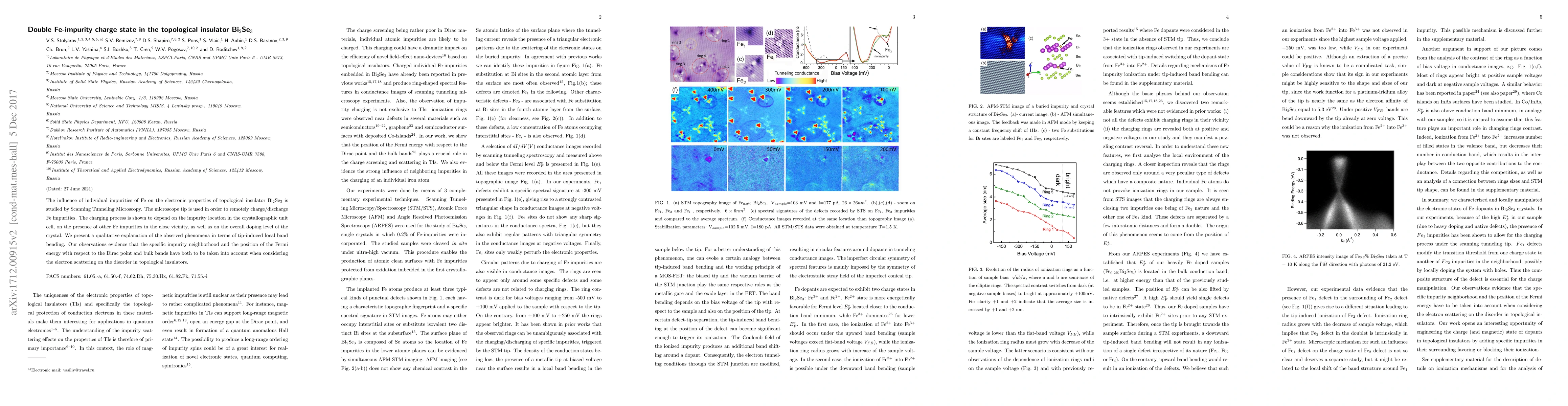The influence of individual impurities of Fe on the electronic properties of topological insulator Bi$_2$Se$_3$ is studied by Scanning Tunneling Microscopy. The microscope tip is used in order to remotely charge/discharge Fe impurities. The charging process is shown to depend on the impurity location in the crystallographic unit cell, on the presence of other Fe impurities in the close vicinity, as well as on the overall doping level of the crystal. We present a qualitative explanation of the observed phenomena in terms of tip-induced local band bending. Our observations evidence that the specific impurity neighborhood and the position of the Fermi energy with respect to the Dirac point and bulk bands have both to be taken into account when considering the electron scattering on the disorder in topological insulators.