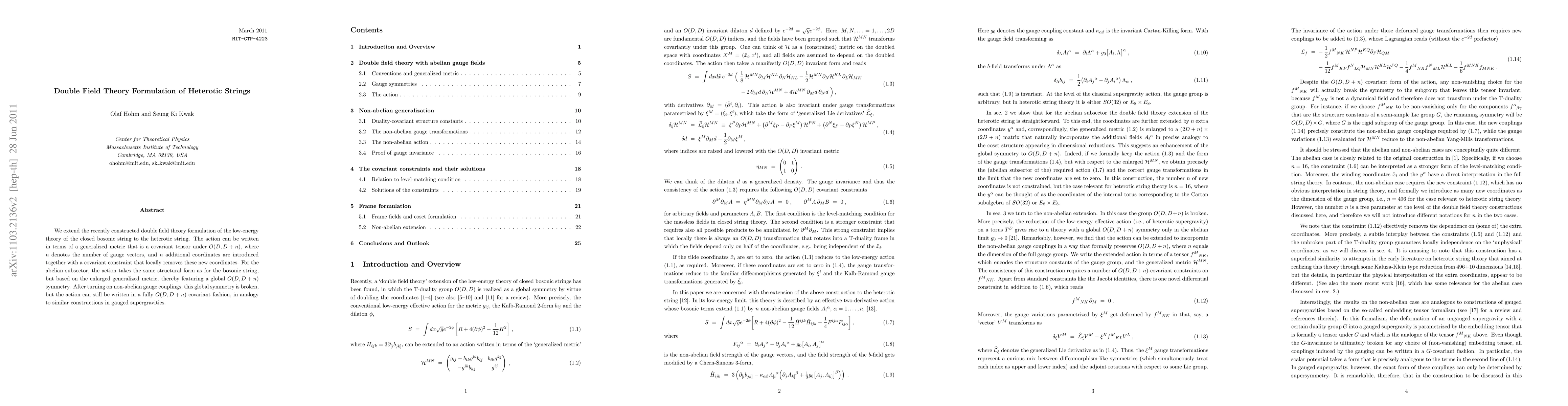 The paper extends the double field theory framework to heterotic strings, utilizing a generalized metric under O(D,D+n) symmetry. Despite gauge coupling-induced symmetry breaking, the action maintains O(D,D+n) covariance akin to gauged supergravities.