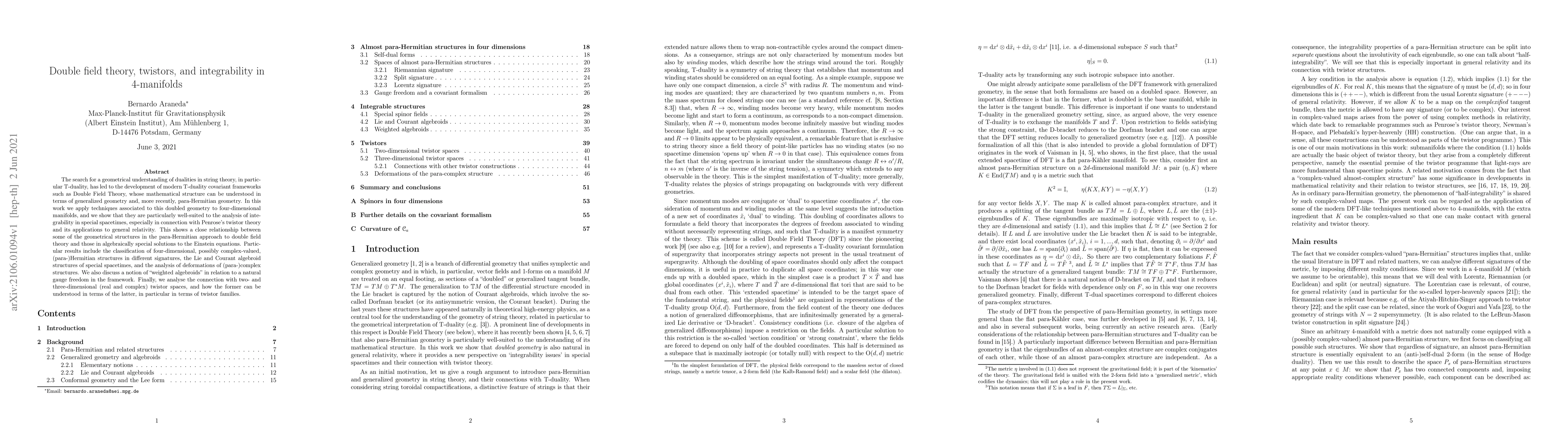 This paper explores the application of Double Field Theory and para-Hermitian geometry to four-dimensional manifolds, revealing strong ties between these frameworks and the integrability properties of spacetimes, particularly via Penrose's twistor theory. It includes classifications of (para-)Hermitian structures and analyses of associated algebroid structures, highlighting a connection to twistor spaces.