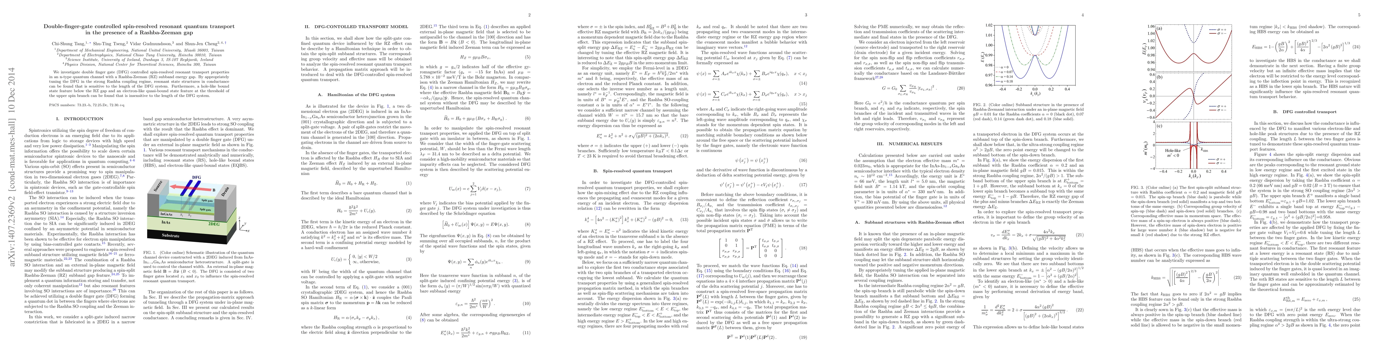 This paper explores how double finger gate (DFG) control influences spin-resolved resonant quantum transport in an n-type quantum channel with a Rashba-Zeeman gap. It reveals that DFG tuning can create resonant conductance states sensitive to the DFG length, alongside hole-like and electron-like bound states that remain unaffected by DFG length.