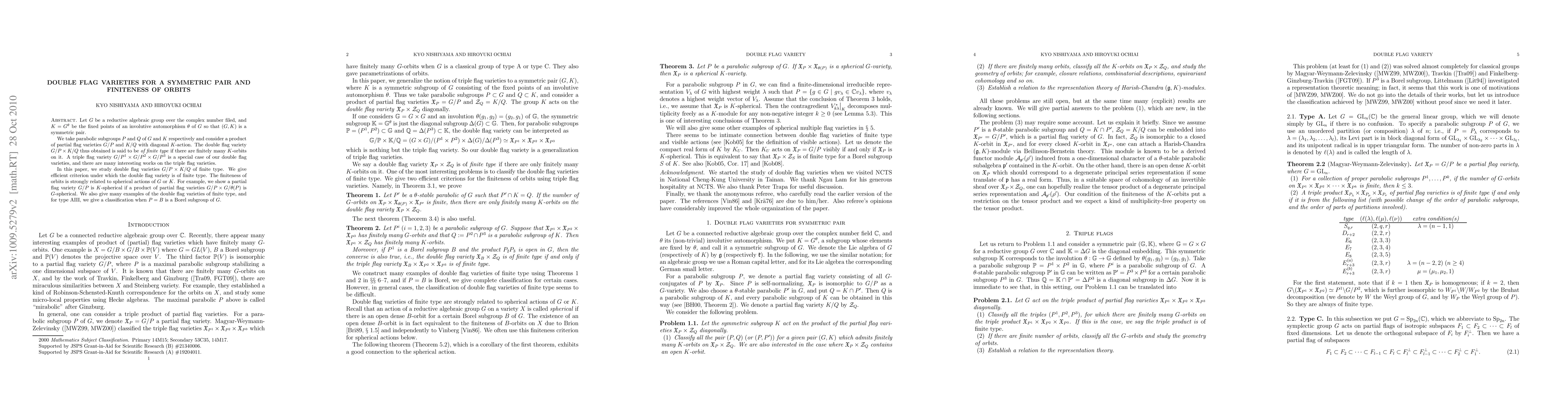 Let G be a reductive algebraic group over the complex number filed, and K = G^{\theta} be the fixed points of an involutive automorphism \theta of G so that (G, K) is a symmetric pair. We take parabolic subgroups P and Q of G and K respectively and consider a product of partial flag varieties G/P and K/Q with diagonal K-action. The double flag variety G/P \times K/Q thus obtained is said to be of finite type if there are finitely many K-orbits on it. A triple flag variety G/P^1 \times G/P^2 \times G/P^3 is a special case of our double flag varieties, and there are many interesting works on the triple flag varieties. In this paper, we study double flag varieties G/P \times K/Q of finite type. We give efficient criterion under which the double flag variety is of finite type. The finiteness of orbits is strongly related to spherical actions of G or K. For example, we show a partial flag variety G/P is K-spherical if a product of partial flag varieties G/P \times G/\theta(P) is G-spherical. We also give many examples of the double flag varieties of finite type, and for type AIII, we give a classification when P = B is a Borel subgroup of G.