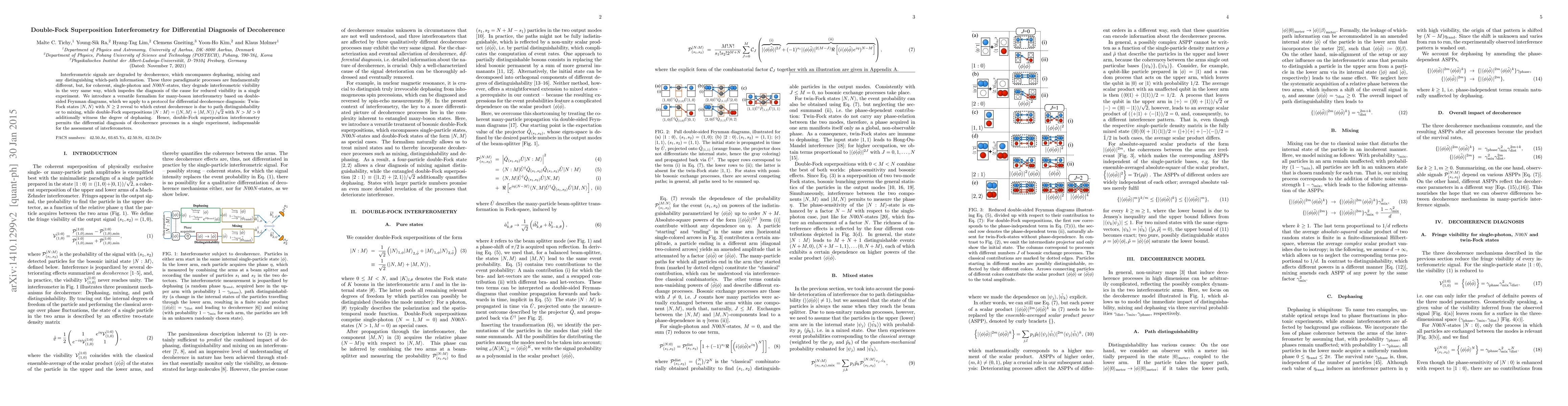 Interferometric signals are degraded by decoherence, which encompasses dephasing, mixing and any distinguishing which-path information. These three paradigmatic processes are fundamentally different, but, for coherent, single-photon and $N00N$-states, they degrade interferometric visibility in the very same way, which impedes the diagnosis of the cause for reduced visibility in a single experiment. We introduce a versatile formalism for many-boson interferometry based on double-sided Feynman diagrams, which we apply to a protocol for differential decoherence diagnosis: Twin-Fock states |N,N> with $N \ge 2$ reveal to which extent decoherence is due to path distinguishability or to mixing, while double-Fock superpositions $|N:M> = (|N,M> + |M,N>)/\sqrt{2} $ with $N > M >0$ additionally witness the degree of dephasing. Hence, double-Fock superposition interferometry permits the differential diagnosis of decoherence processes in a single experiment, indispensable for the assessment of interferometers.