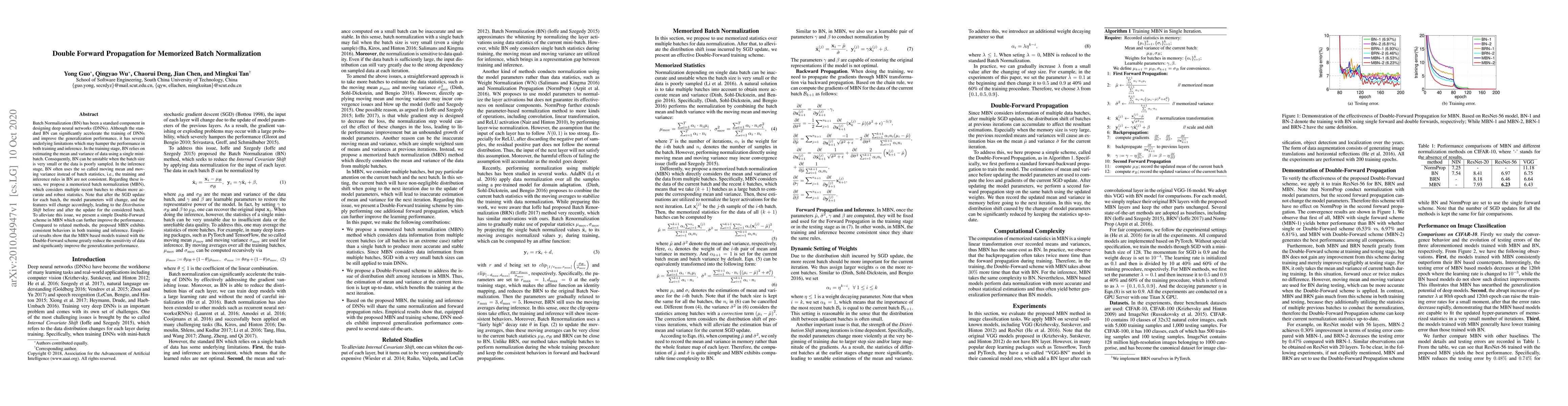 Batch Normalization (BN) has been a standard component in designing deep neural networks (DNNs). Although the standard BN can significantly accelerate the training of DNNs and improve the generalization performance, it has several underlying limitations which may hamper the performance in both training and inference. In the training stage, BN relies on estimating the mean and variance of data using a single minibatch. Consequently, BN can be unstable when the batch size is very small or the data is poorly sampled. In the inference stage, BN often uses the so called moving mean and moving variance instead of batch statistics, i.e., the training and inference rules in BN are not consistent. Regarding these issues, we propose a memorized batch normalization (MBN), which considers multiple recent batches to obtain more accurate and robust statistics. Note that after the SGD update for each batch, the model parameters will change, and the features will change accordingly, leading to the Distribution Shift before and after the update for the considered batch. To alleviate this issue, we present a simple Double-Forward scheme in MBN which can further improve the performance. Compared to related methods, the proposed MBN exhibits consistent behaviors in both training and inference. Empirical results show that the MBN based models trained with the Double-Forward scheme greatly reduce the sensitivity of data and significantly improve the generalization performance.