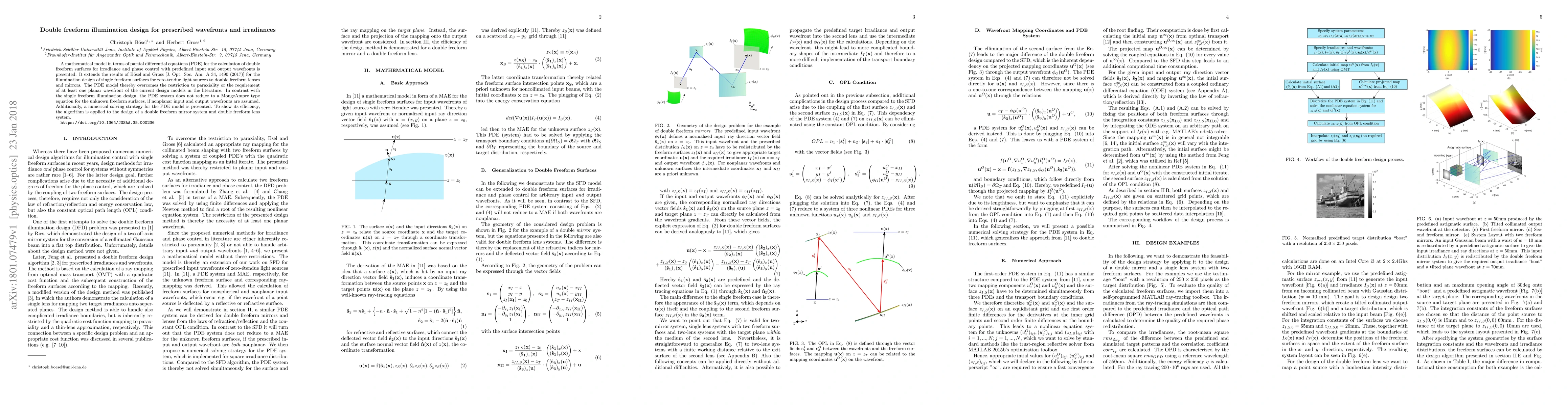 This paper presents a mathematical model using partial differential equations to design double freeform surfaces for precise control of irradiance and phase with prescribed wavefronts, extending previous single freeform designs. It overcomes limitations of existing models and includes a numerical solving strategy, demonstrated through the design of double freeform mirrors and lenses.