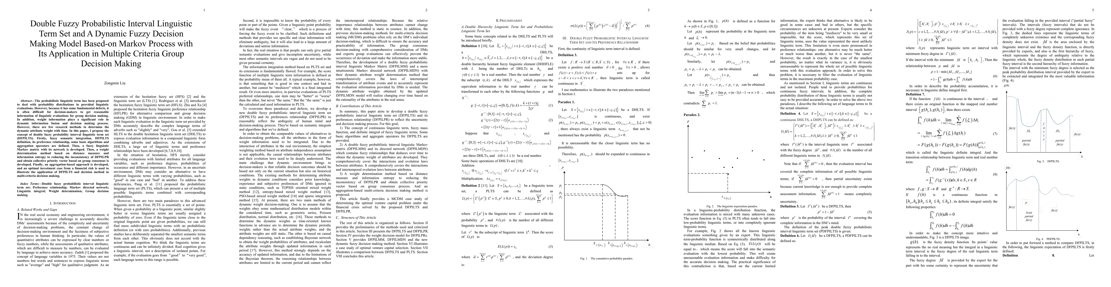 This paper introduces the double fuzzy probabilistic interval linguistic term set (DFPILTS) to enhance group decision-making processes. It proposes a dynamic fuzzy decision-making model based on a Markov process, incorporating a method for determining dynamic attribute weights over time, and demonstrates its application through an optimal investment case.
