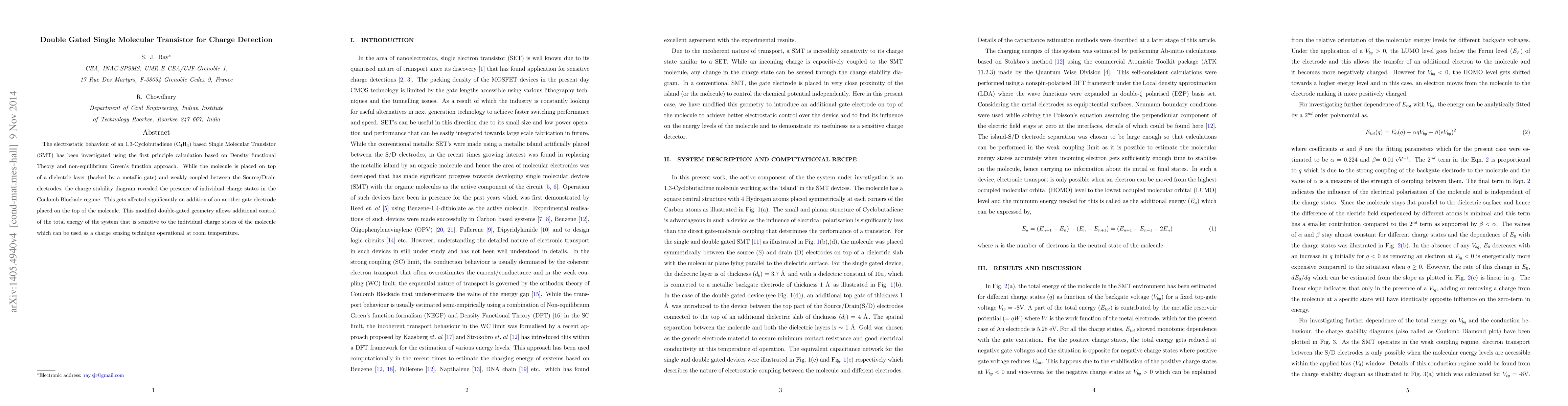 This paper investigates the electrostatic behavior of a 1,3-Cyclobutadiene based Single Molecular Transistor using Density functional Theory and non-equilibrium Green's function. The double-gated configuration enhances the control over the molecule's charge states, enabling effective charge detection at room temperature.