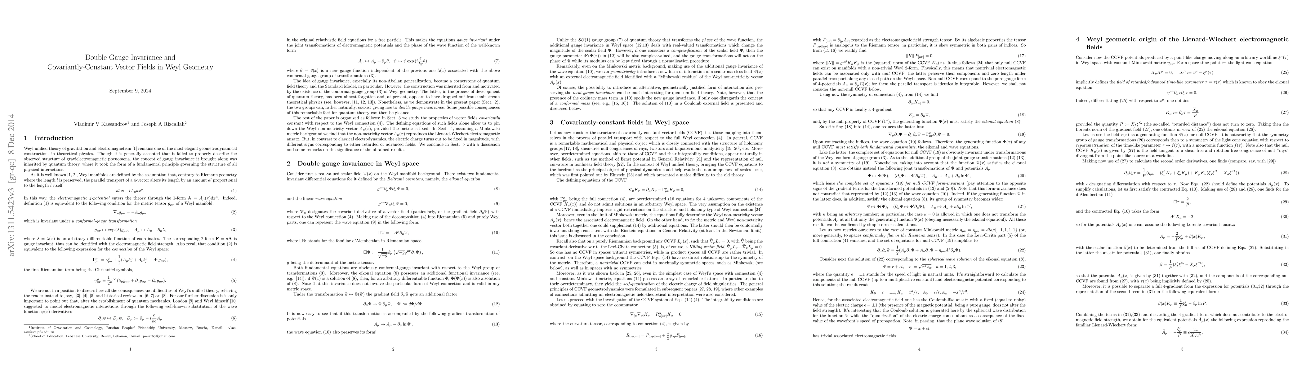 Research reveals a new gauge invariance for equations of covariantly-constant vector fields in Weyl geometry, linking the electromagnetic potential to particle/antiparticle asymmetry.