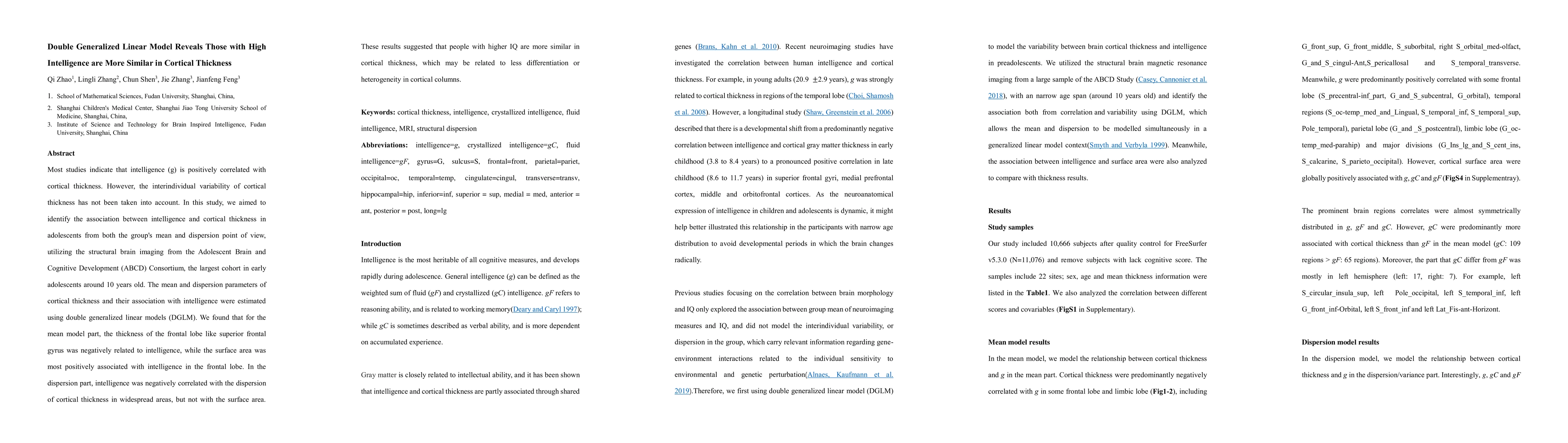This study uses double generalized linear models to explore the relationship between intelligence and cortical thickness in adolescents, revealing that higher intelligence correlates with less variability in cortical thickness across widespread brain areas, suggesting reduced differentiation in cortical columns.