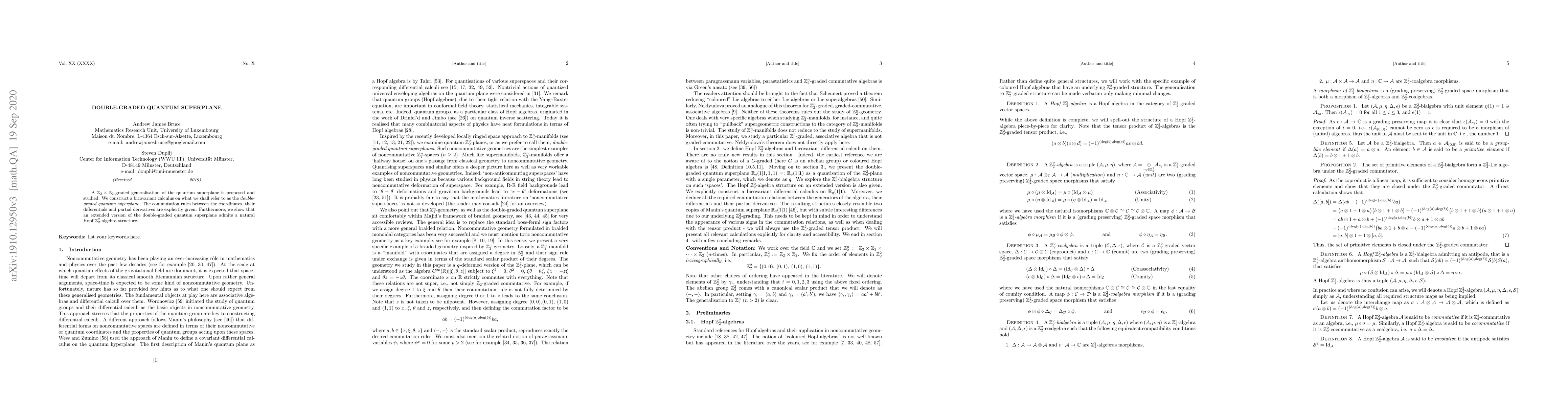 A $\mathbb{Z}_2 \times \mathbb{Z}_2$-graded generalisation of the quantum superplane is proposed and studied. We construct a bicovariant calculus on what we shall refer to as the \emph{double-graded quantum superplane}. The commutation rules between the coordinates, their differentials and partial derivatives are explicitly given. Furthermore, we show that an extended version of the double-graded quantum superplane admits a natural Hopf $\mathbb{Z}_2^2$-algebra structure.