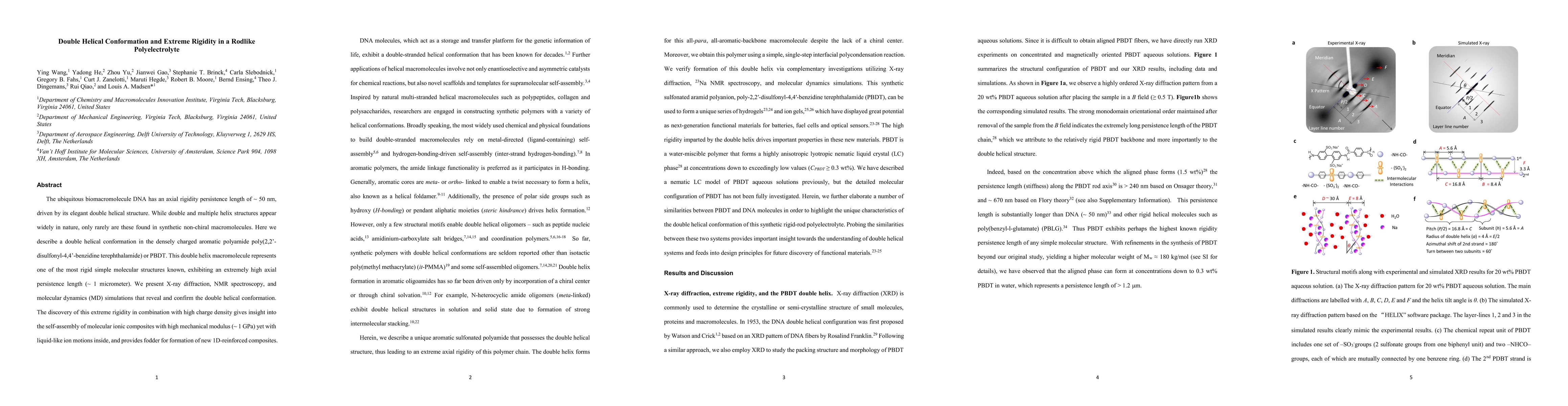 The study describes a densely charged aromatic polyamide, PBDT, adopting a double helical structure with unprecedented axial rigidity, characterized by a persistence length of ~1 micrometer. This extreme rigidity, coupled with high charge density, suggests potential for creating novel 1D-reinforced composites with high mechanical modulus and liquid-like ion mobility.