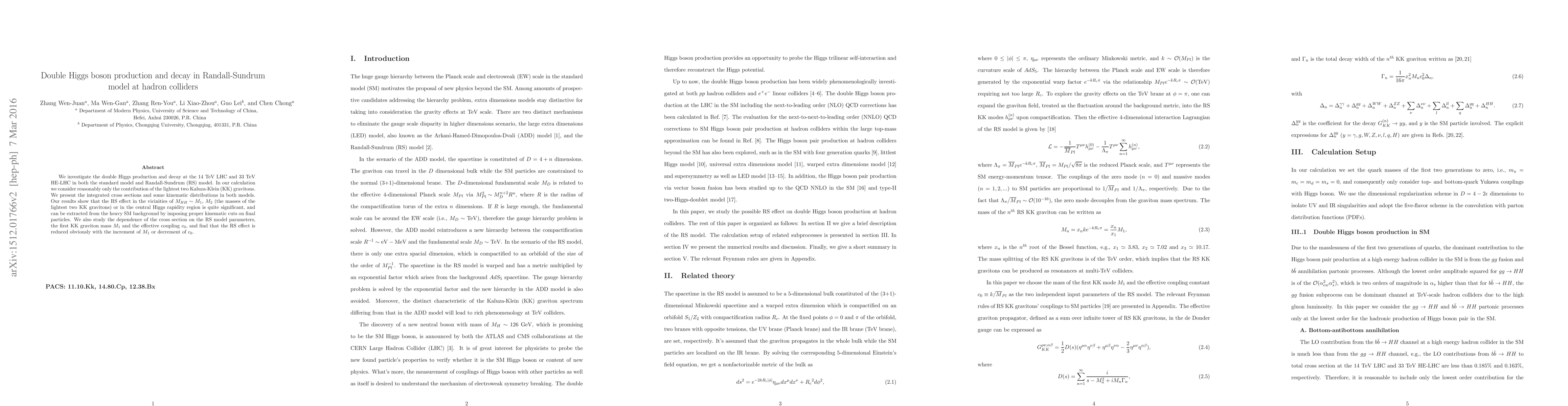 We investigate the double Higgs production and decay at the $14~ {\rm TeV}$ LHC and $33~ {\rm TeV}$ HE-LHC in both the standard model and Randall-Sundrum (RS) model. In our calculation we consider reasonably only the contribution of the lightest two Kaluza-Klein (KK) gravitons. We present the integrated cross sections and some kinematic distributions in both models. Our results show that the RS effect in the vicinities of $M_{HH} \sim M_{1}$, $M_{2}$ (the masses of the lightest two KK gravitons) or in the central Higgs rapidity region is quite significant, and can be extracted from the heavy SM background by imposing proper kinematic cuts on final particles. We also study the dependence of the cross section on the RS model parameters, the first KK graviton mass $M_1$ and the effective coupling $c_0$, and find that the RS effect is reduced obviously with the increment of $M_1$ or decrement of $c_0$.