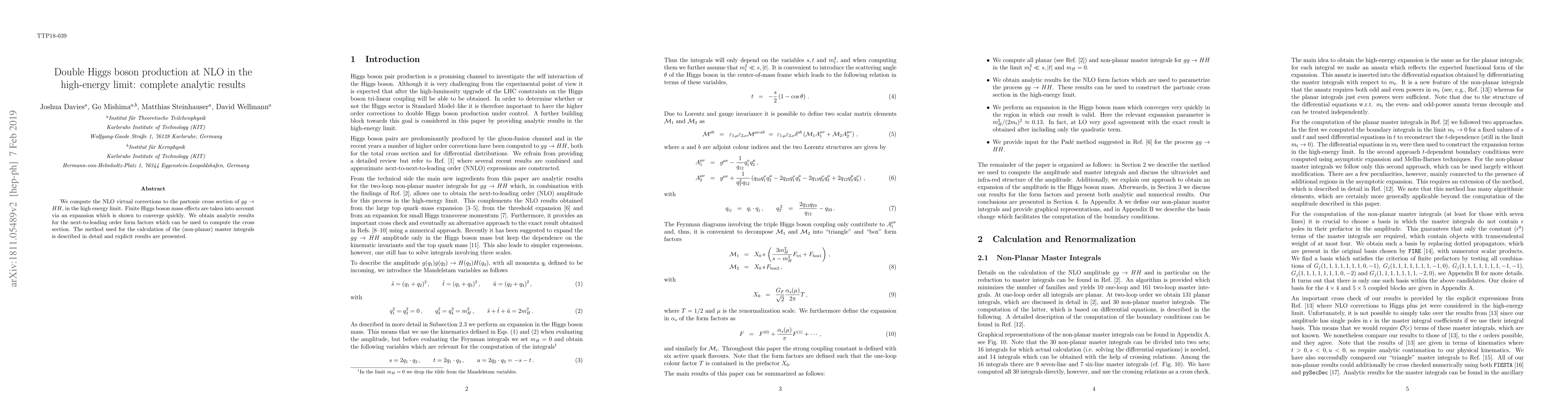 We compute the NLO virtual corrections to the partonic cross section of $gg\to HH$, in the high energy limit. Finite Higgs boson mass effects are taken into account via an expansion which is shown to converge quickly. We obtain analytic results for the next-to-leading order form factors which can be used to compute the cross section. The method used for the calculation of the (non-planar) master integrals is described in detail and explicit results are presented.