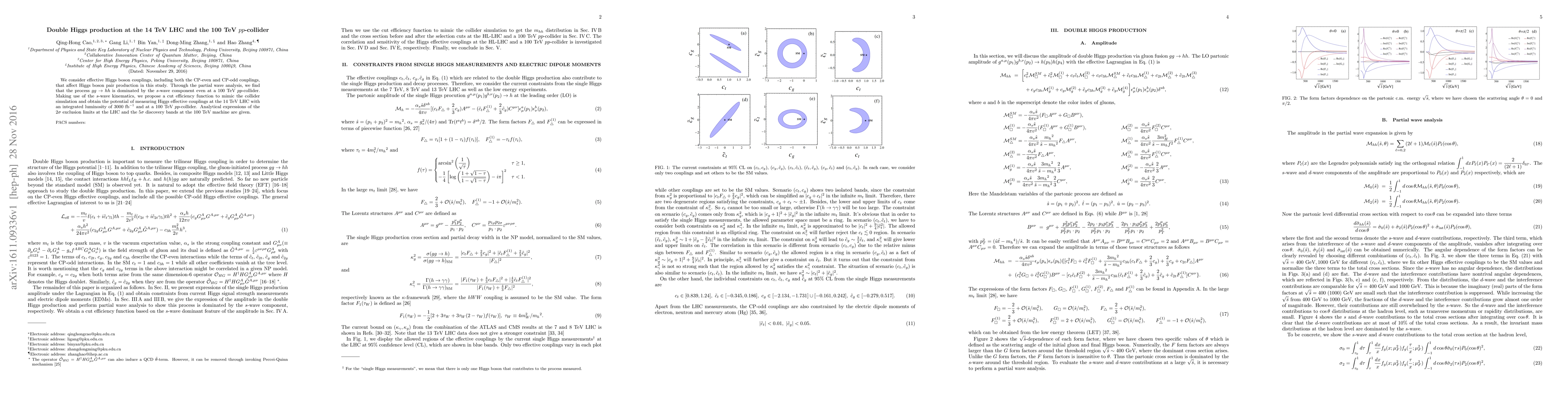 We consider effective Higgs boson couplings, including both the CP-even and CP-odd couplings, that affect Higgs boson pair production in this study. Through the partial wave analysis, we find that the process $gg\to hh$ is dominated by the $s$-wave component even at a 100~TeV $pp$-collider. Making use of the $s$-wave kinematics, we propose a cut efficiency function to mimic the collider simulation and obtain the potential of measuring Higgs effective couplings at the 14~TeV LHC with an integrated luminosity of $3000~{\rm fb}^{-1}$ and at a 100 TeV $pp$-collider. Analytical expressions of the $2\sigma$ exclusion limits at the LHC and the $5\sigma$ discovery bands at the 100 TeV machine are given.