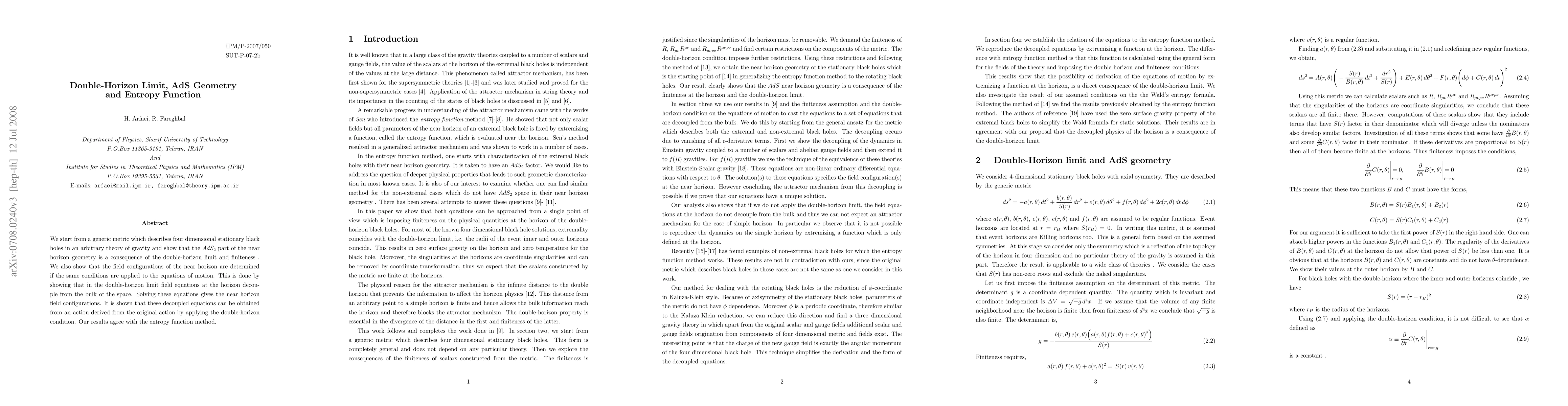 We start from a generic metric which describes four dimensional stationary black holes in an arbitrary theory of gravity and show that the AdS_2 part of the near horizon geometry is a consequence of the double-horizon limit and finiteness . We also show that the field configurations of the near horizon are determined if the same conditions are applied to the equations of motion. This is done by showing that in the double-horizon limit field equations at the horizon decouple from the bulk of the space. Solving these equations gives the near horizon field configurations. It is shown that these decoupled equations can be obtained from an action derived from the original action by applying the double-horizon condition. Our results agree with the entropy function method.