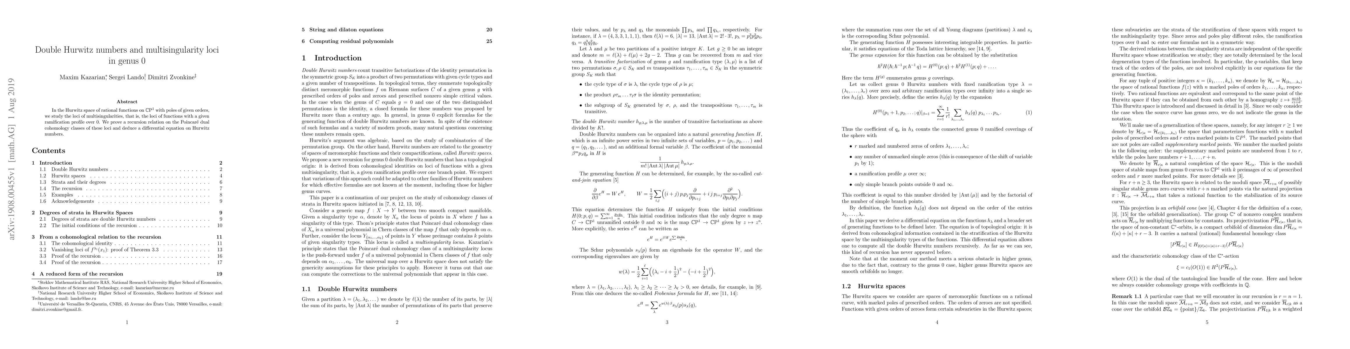 This paper investigates the loci of multisingularities in Hurwitz space, focusing on rational functions on CP^1 with specified ramification profiles. The authors establish a recursion relation for the cohomology classes of these loci and derive a differential equation for Hurwitz numbers.