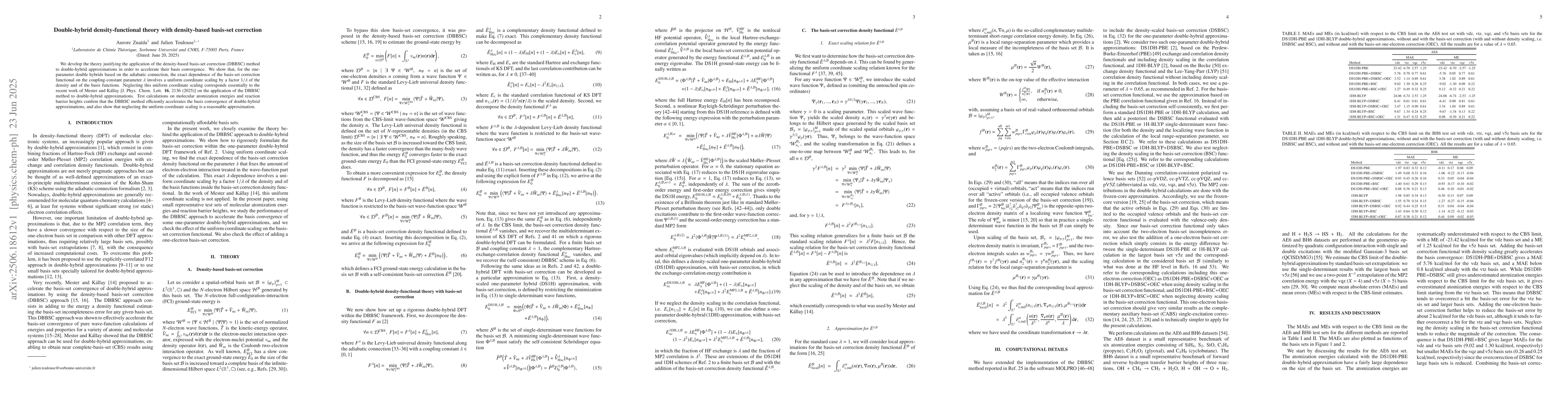 We develop the theory justifying the application of the density-based basis-set correction (DBBSC) method to double-hybrid approximations in order to accelerate their basis convergence. We show that, for the oneparameter double hybrids based on the adiabatic connection, the exact dependence of the basis-set correction functional on the coupling-constant parameter $\lambda$ involves a uniform coordinate scaling by a factor 1/$\lambda$ of the density and of the basis functions. Neglecting this uniform coordinate scaling corresponds essentially to the recent work of Mester and K{\'a}llay [J. Phys. Chem. Lett. 16, 2136 (2025)] on the application of the DBBSC method to double-hybrid approximations. Test calculations on molecular atomization energies and reaction barrier heights confirm that the DBBSC method efficiently accelerates the basis convergence of double-hybrid approximations, and also show that neglecting the uniform coordinate scaling is a reasonable approximation.