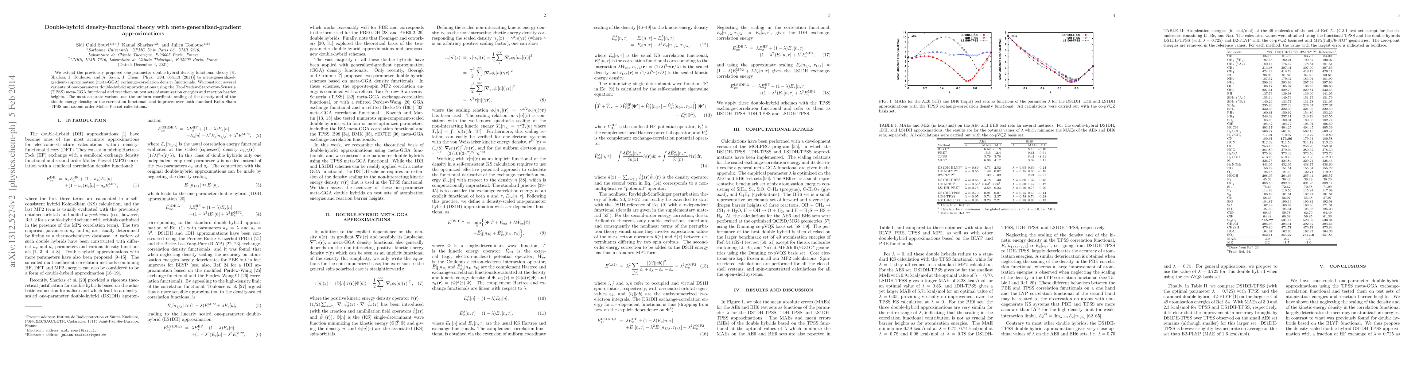 This paper extends one-parameter double-hybrid density-functional theory to meta-GGA functionals, specifically using TPSS, and evaluates its performance on atomization energies and reaction barriers, finding it more accurate than standard Kohn-Sham TPSS and second-order Moller-Plesset methods.