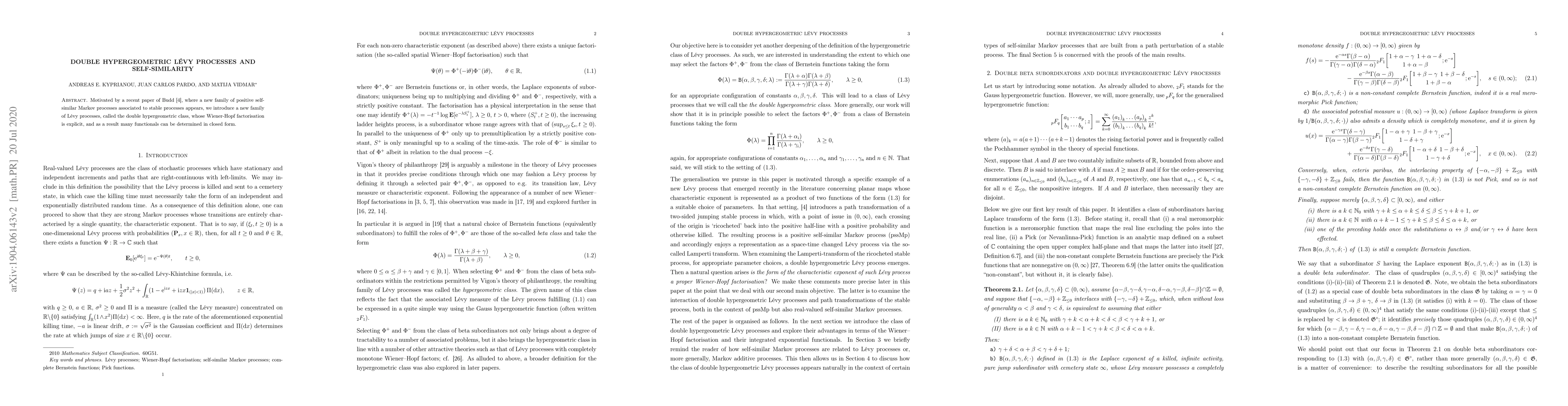 Summary: This paper introduces a new class of double hypergeometric Lévy processes, characterized by explicit Wiener-Hopf factorization, enabling the determination of many functionals in closed form, inspired by a recent study on self-similar Markov processes. The processes exhibit self-similarity and have applications in modeling complex stochastic phenomena.