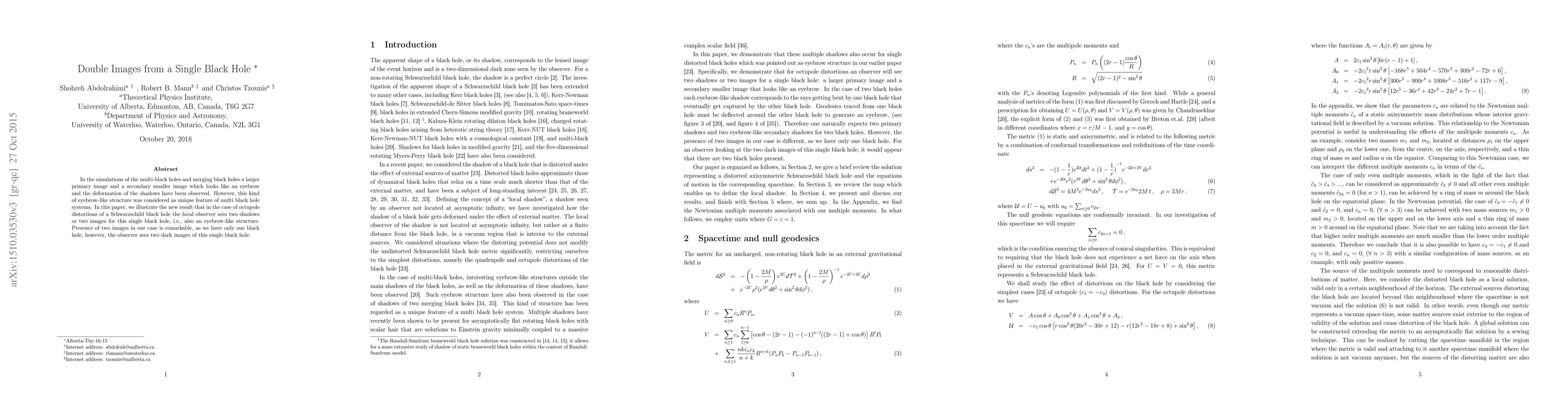 In the simulations of the multi-black holes and merging black holes a larger primary image and a secondary smaller image which looks like an eyebrow and the deformation of the shadows have been observed. However, this kind of eyebrow-like structure was considered as unique feature of multi black hole systems. In this paper, we illustrate the new result that in the case of octupole distortions of a Schwarzschild black hole the local observer sees two shadows or two images for this single black hole, i.e., also an eyebrow-like structure. Presence of two images in our case is remarkable, as we have only one black hole, however, the observer sees two dark images of this single black hole.