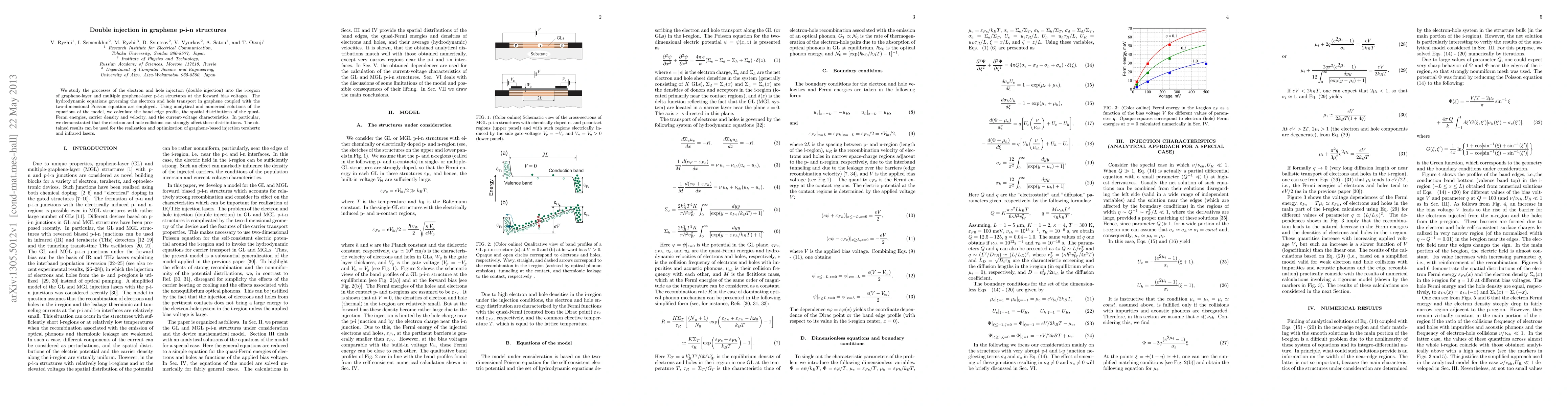 We study the processes of the electron and hole injection (double injection) into the i-region of graphene-layer and multiple graphene-layer p-i-n structures at the forward bias voltages. The hydrodynamic equations governing the electron and hole transport in graphene coupled with the two-dimensional Poisson equation are employed. Using analytical and numerical solutions of the equations of the model, we calculate the band edge profile, the spatial distributions of the quasi-Fermi energies, carrier density and velocity, and the current-voltage characteristics. In particular, we demonstrated that the electron and hole collisions can strongly affect these distributions. The obtained results can be used for the realization and optimization of graphene-based injection terahertz and infrared lasers.